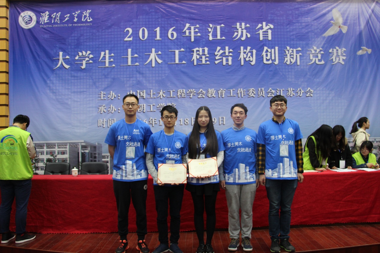 2016年11月18日至19日,2016年江苏省大学生土木工程结构创新竞赛在淮阴工学院举行。我院参赛同学在学院精心组织和多位指导教师和高年级学长的辛勤辅导下,发挥出色,获得二等奖2项,三等奖1项。