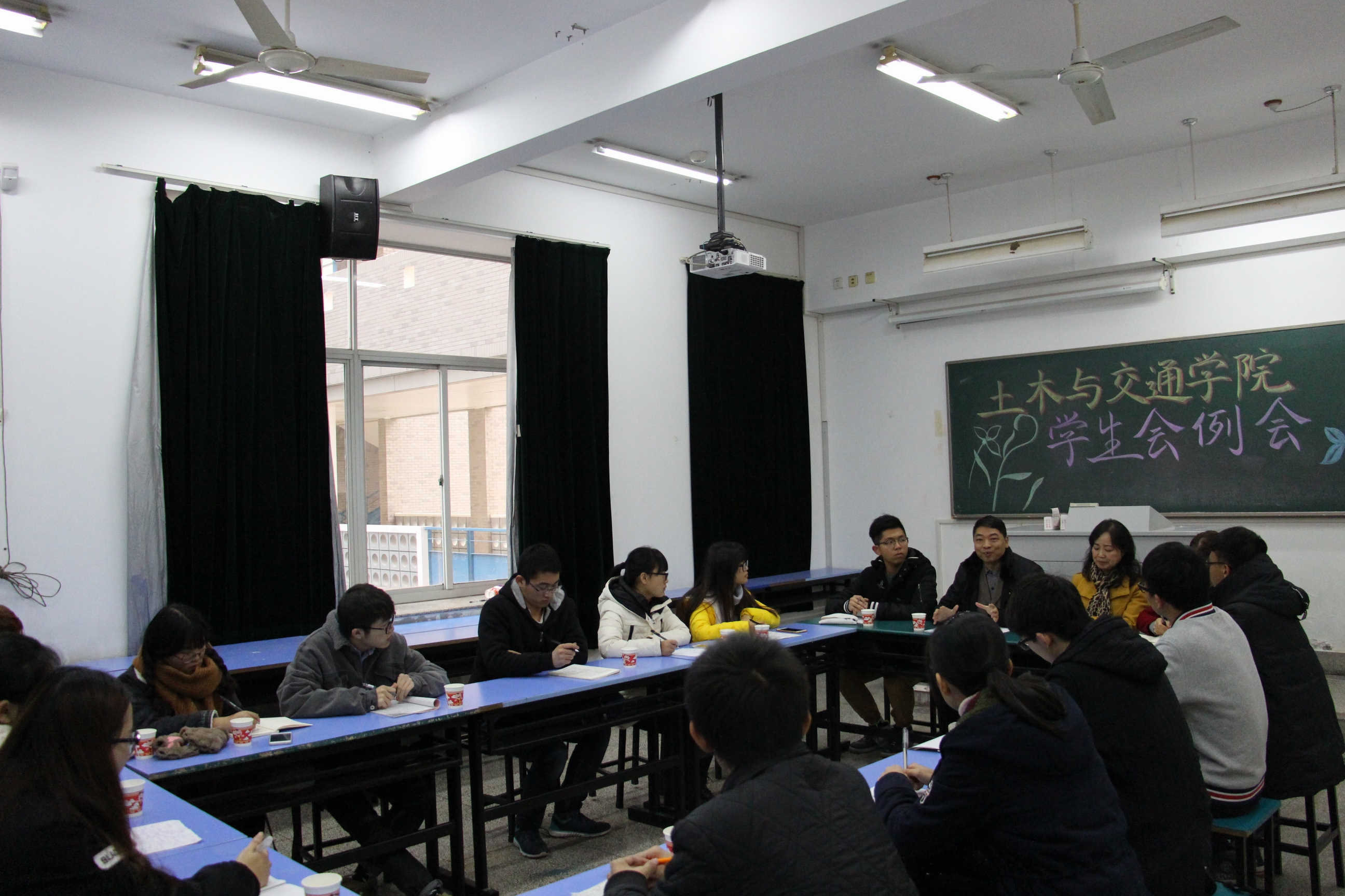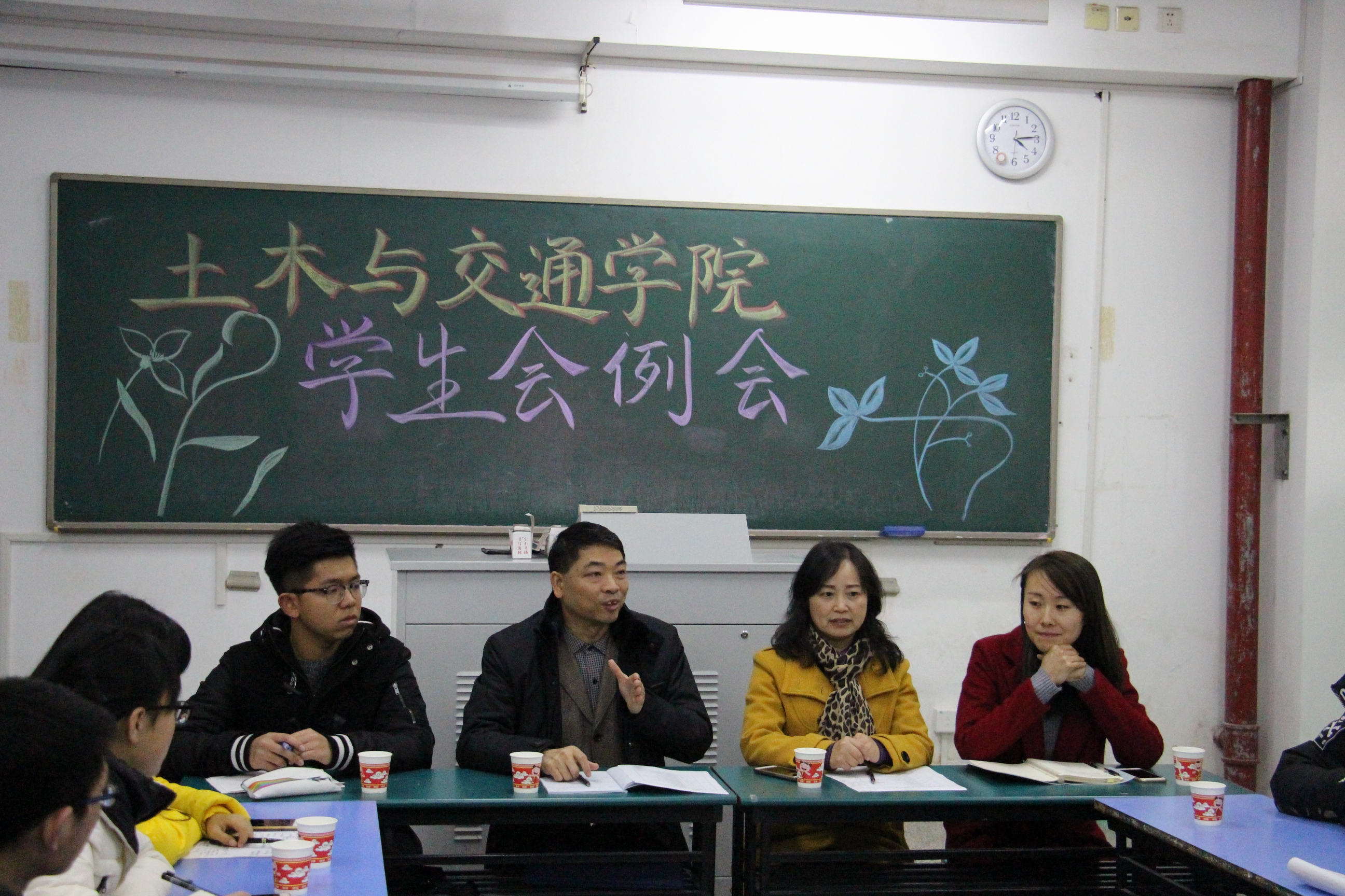 12月14日下午三点,土木与交通学院学生会工作例会在致用308举行。学院院长高玉峰、党委副书记蒋菊与15级辅导员王璐出席会议。
