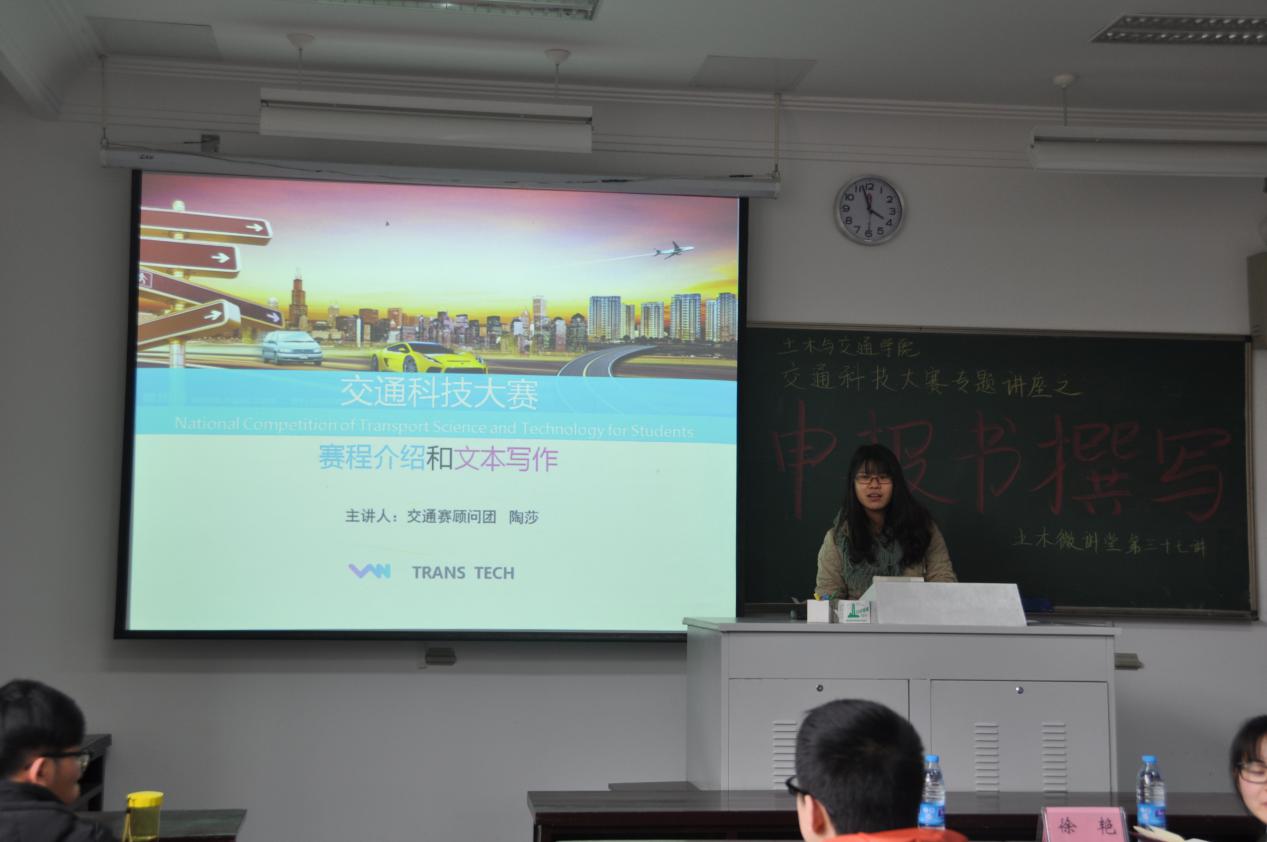 2017年2月23日下午15点50分,土木与交通学院土木微讲堂第三十七讲之“交通科技大赛专题讲座之申报书撰写”在我校西康路校区工程馆207成功举办。本次微讲堂邀请到了13级优秀本科生徐艳、陶莎两位同学作为主讲人,为同学们分享她们撰写申报书的经验。