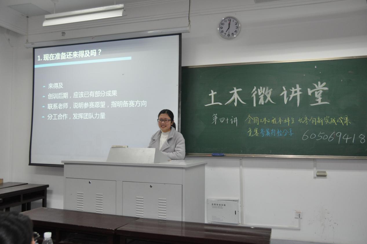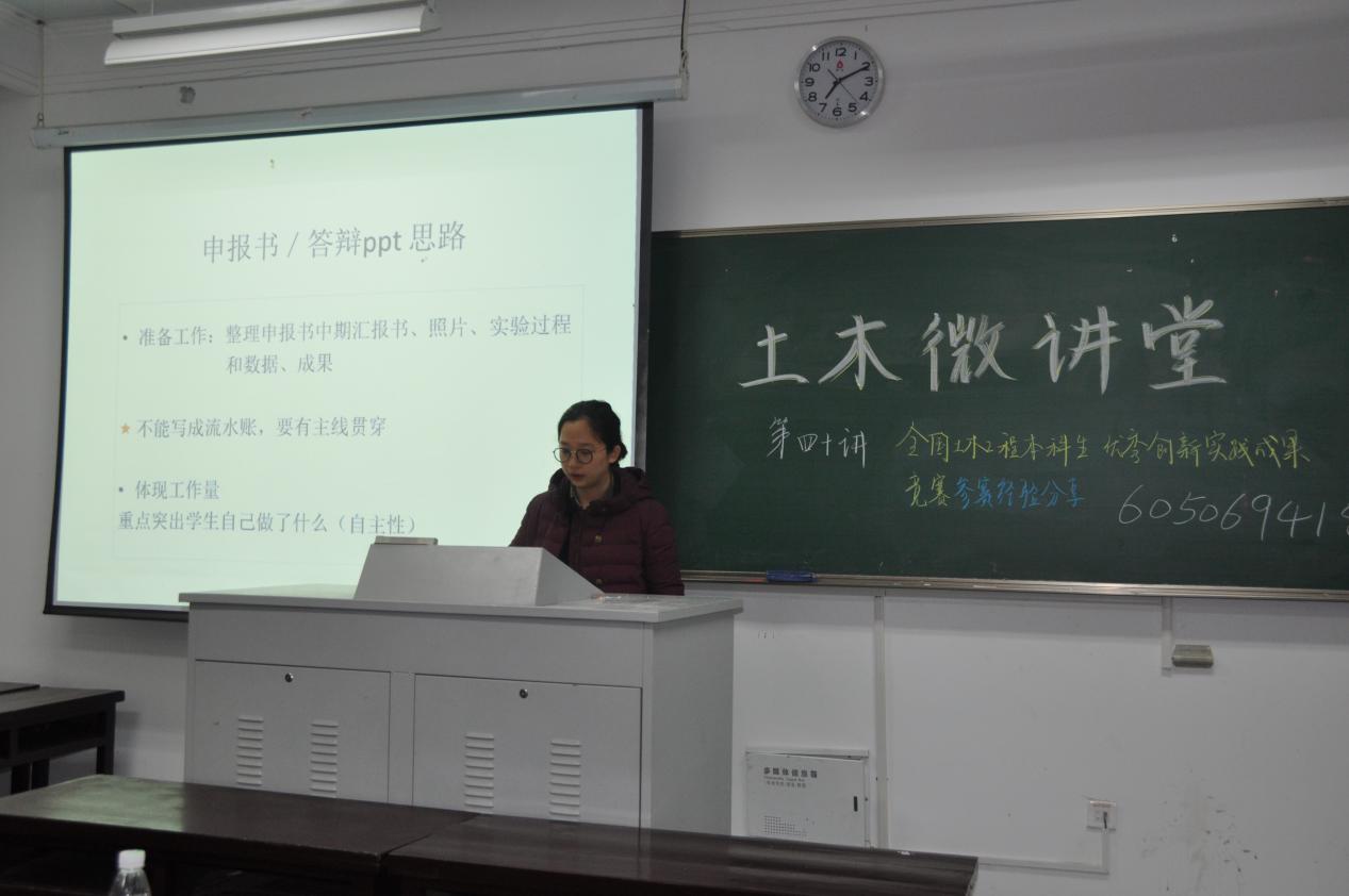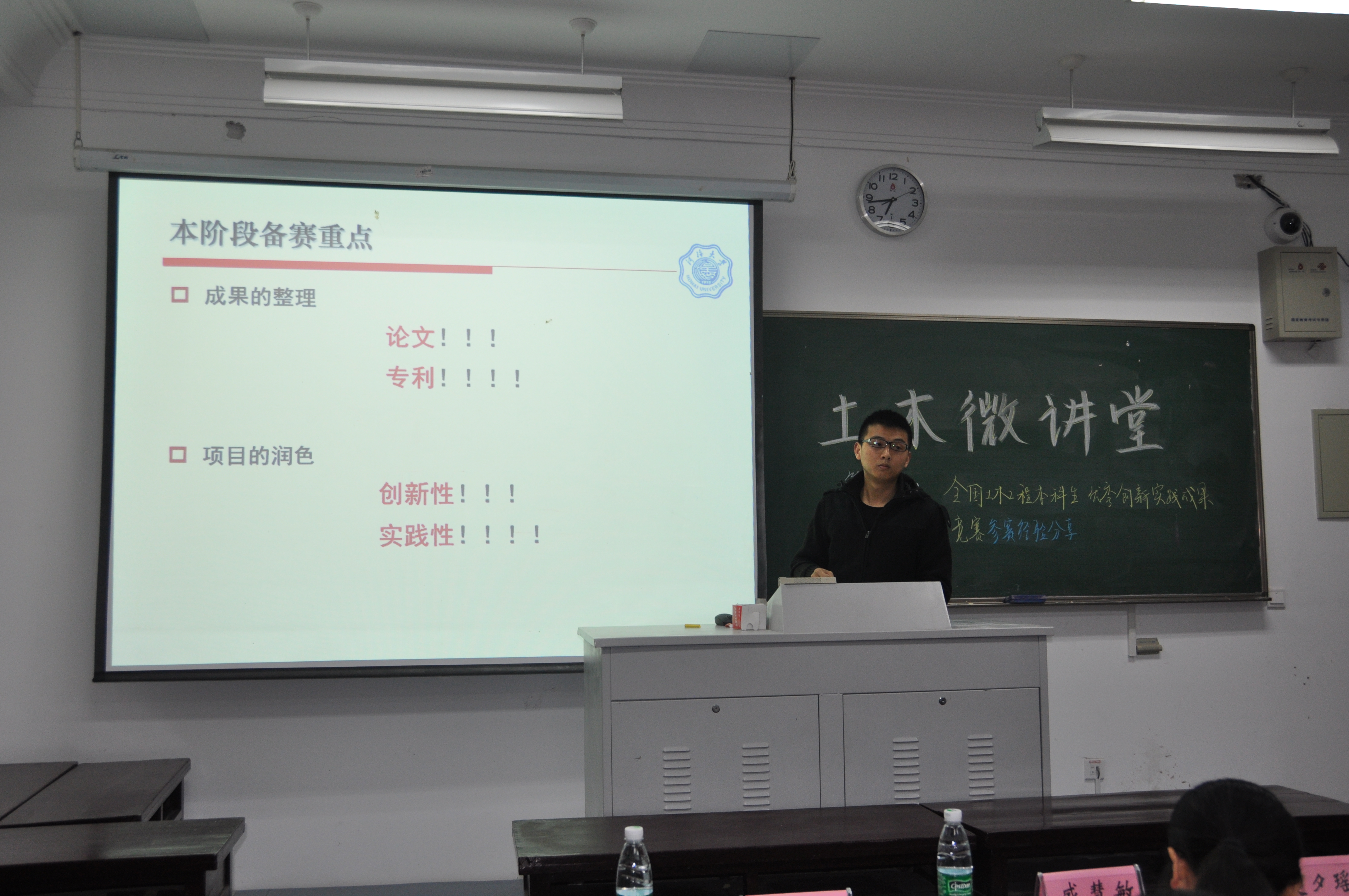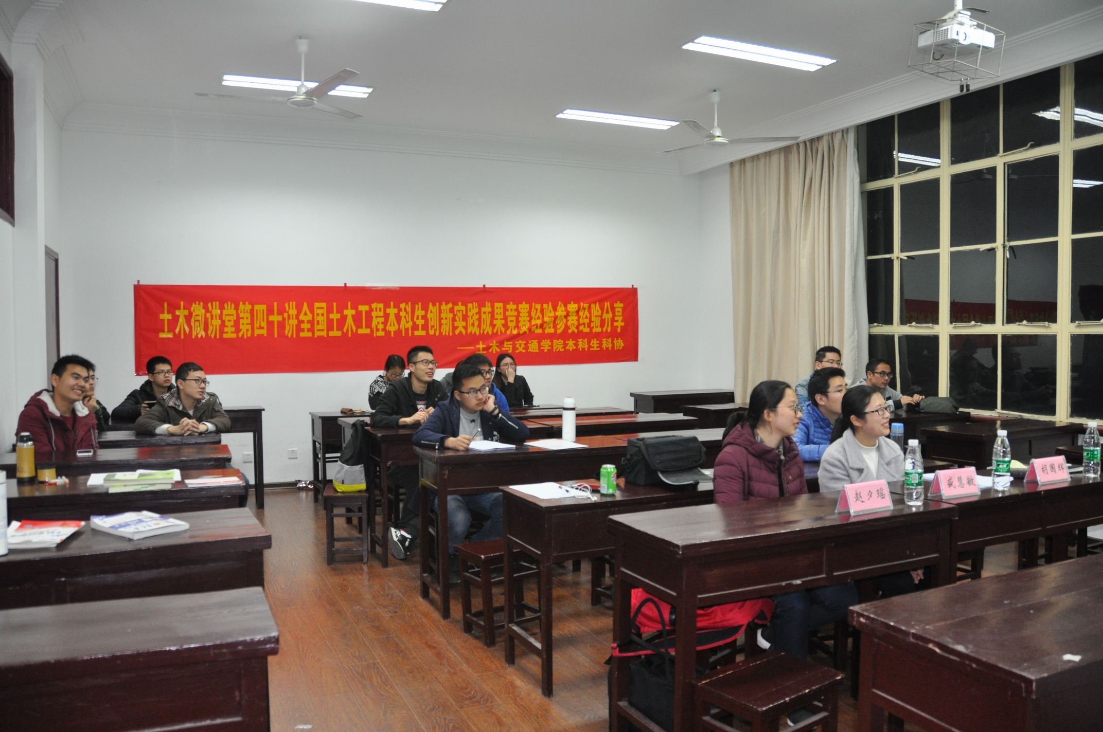 2017年3月9日晚上18点30分,土木与交通学院土木微讲堂第四十讲之“全国土木工程本科生优秀创新实践成果竞赛参赛经验分享”在我校西康路校区工程馆205成功举办。本次微讲堂邀请到了12级土木工程优秀本科生胡国辉、13级土木工程优秀本科生赵夕瑶、盛慧敏三位同学作为主讲人,为同学们分享他们大创赛的参赛经验。