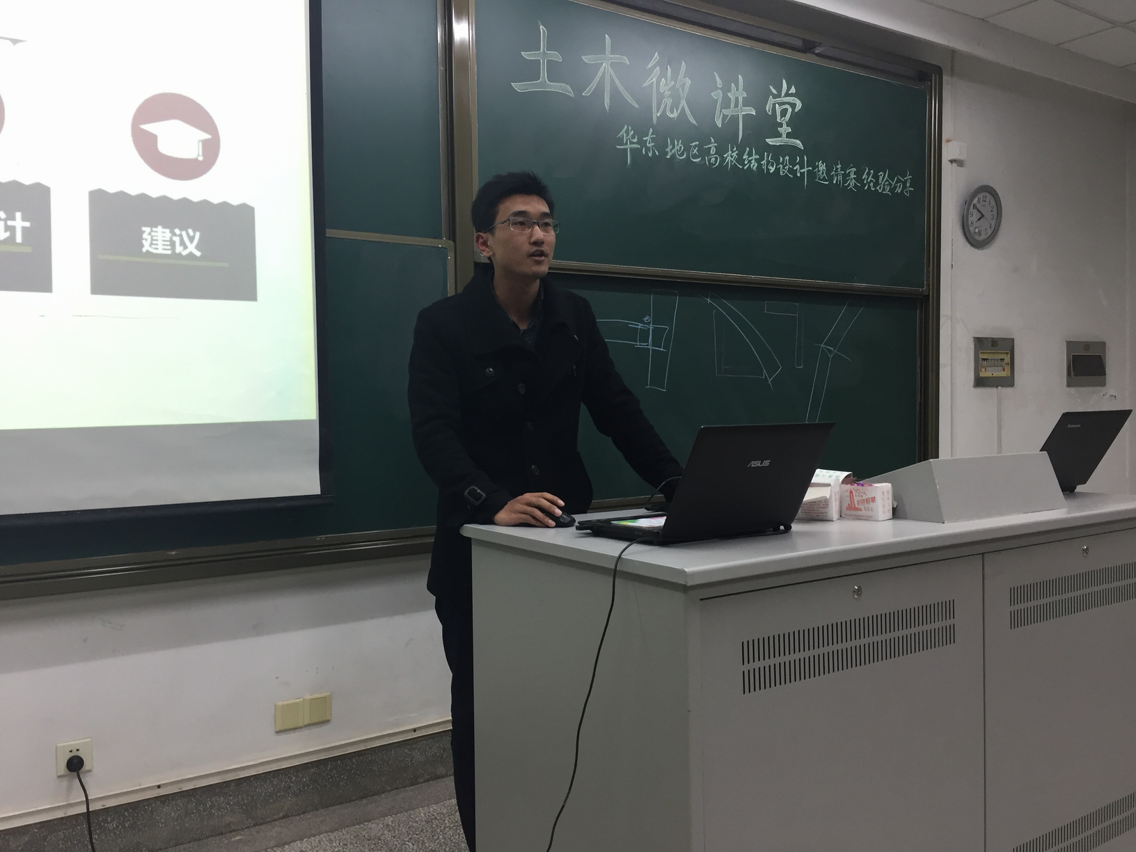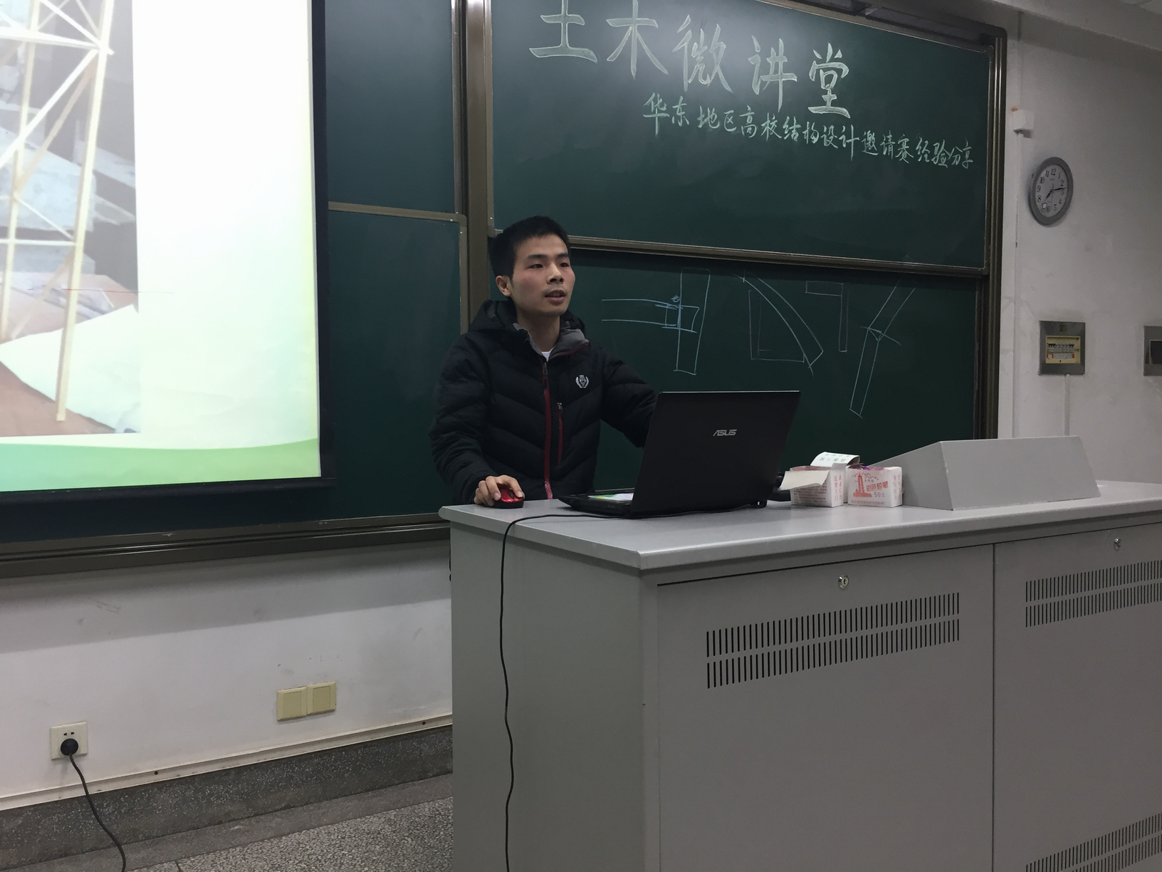 2017年3月18日18点30分,土木与交通学院土木微讲堂第四十一讲之“华东地区结构设计邀请赛经验分享”在江宁校区致用楼317成功举办。本次微讲堂邀请到了12级土木工程优秀本科生罗力中、13级土木工程优秀本科生阚锦照两位同学作为主讲人,为同学们分享他们的参赛经验。