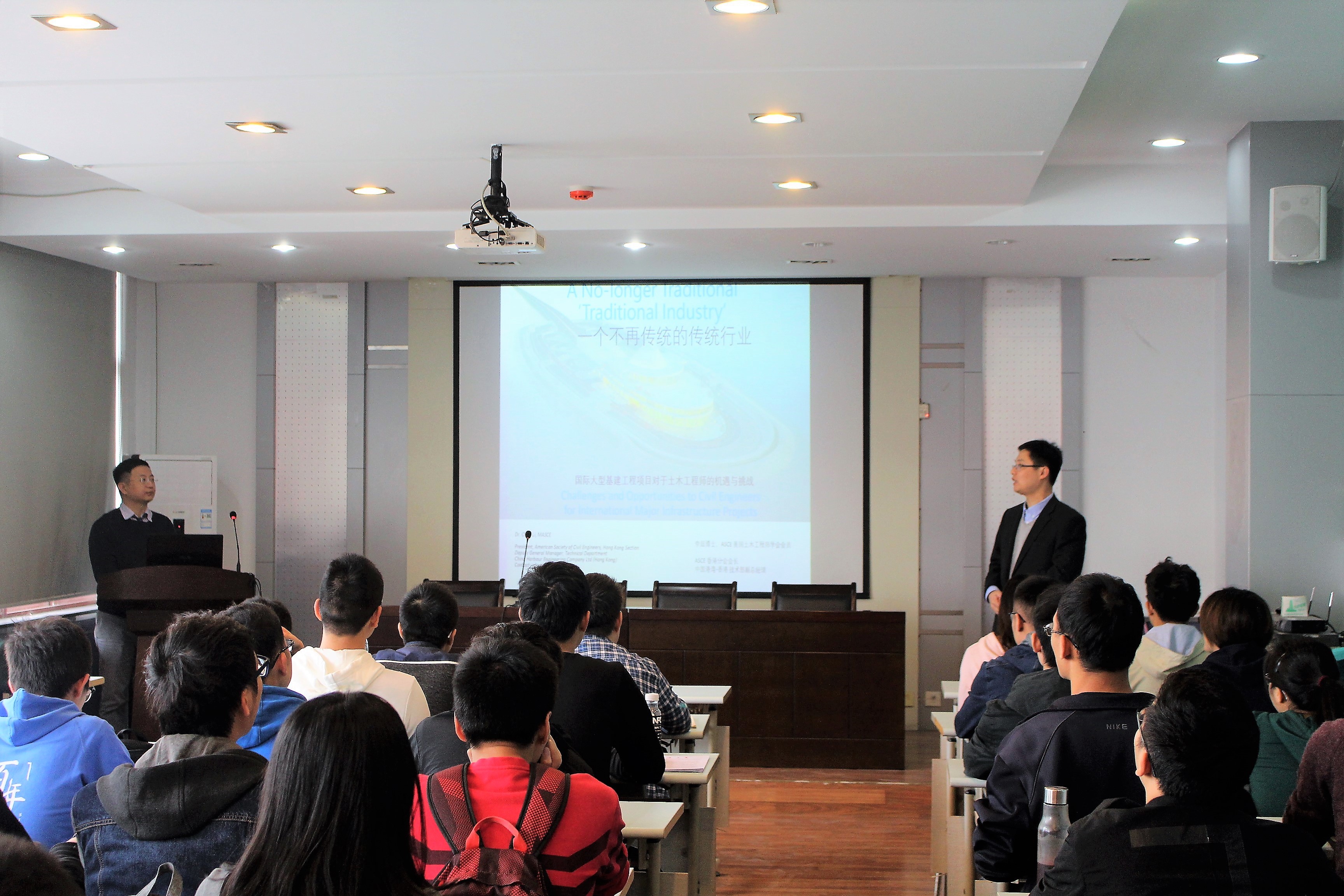 首先,李超会长结合多年参与国际大型基建工程的工作经历,从三个方面——技术的进步、实际工程中涉及到的环境问题、设计与施工间的联系与差异与在场的同学们分享了自己的见解,极大地开拓了同学们的眼界。同时,李会长还着重强调了以后面临具体工程时,不仅要拥有扎实的专业知识,还需要具备法律、合同、商业意识并掌握一些投标的技巧。接着,李会长运用具体的案例向同学们介绍了自己亲身参与过的多个大型国际基建项目中的特色与难点。在最后交流答疑环节中,同学们踊跃提问,李会长细心解答了同学们对未来参与实际工程项目的诸多困惑,并对在场的各位同学提出殷切的期望,希望大家不畏难、有担当、会思考、能吃苦,使同学们受益匪浅。