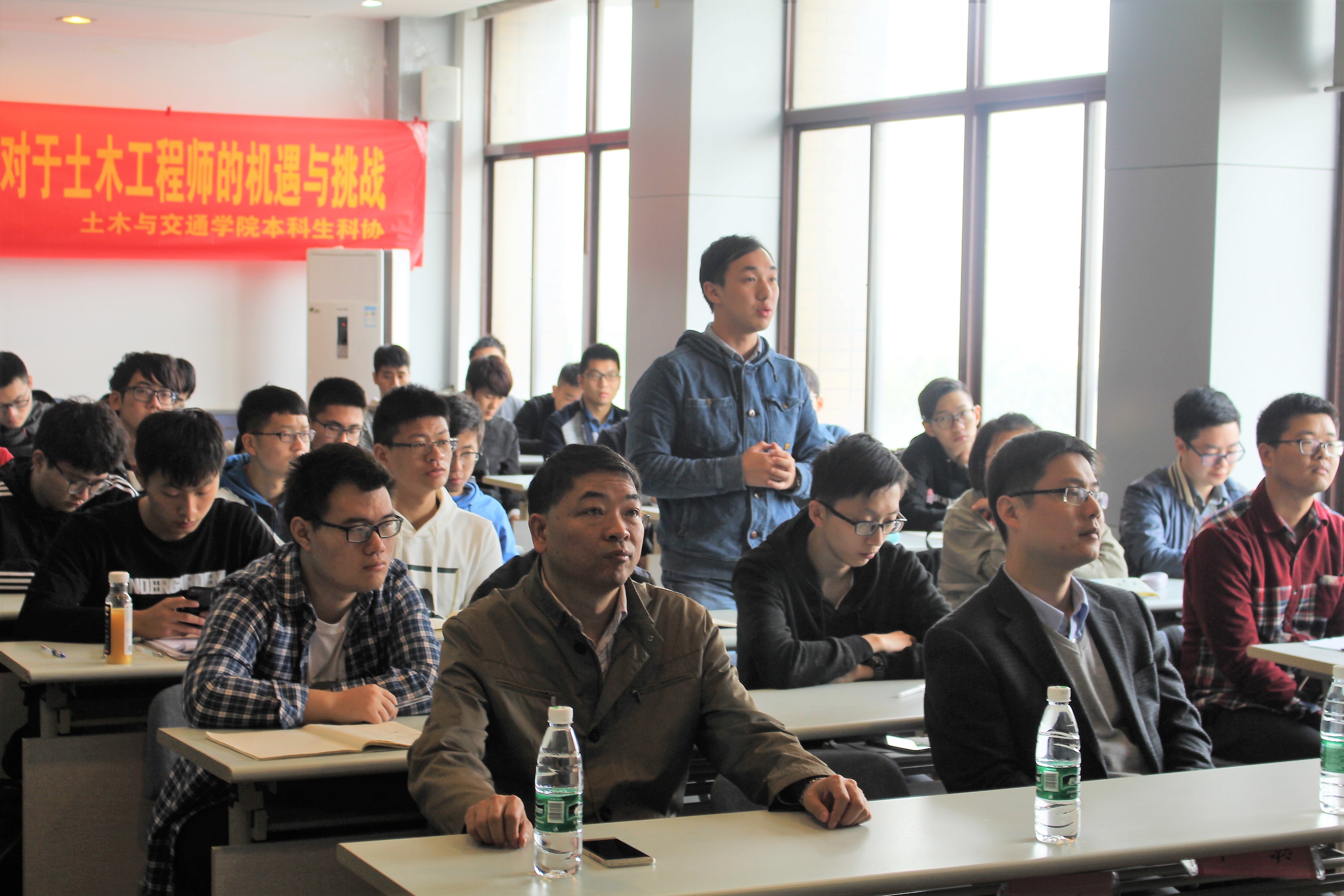 首先,李超会长结合多年参与国际大型基建工程的工作经历,从三个方面——技术的进步、实际工程中涉及到的环境问题、设计与施工间的联系与差异与在场的同学们分享了自己的见解,极大地开拓了同学们的眼界。同时,李会长还着重强调了以后面临具体工程时,不仅要拥有扎实的专业知识,还需要具备法律、合同、商业意识并掌握一些投标的技巧。接着,李会长运用具体的案例向同学们介绍了自己亲身参与过的多个大型国际基建项目中的特色与难点。在最后交流答疑环节中,同学们踊跃提问,李会长细心解答了同学们对未来参与实际工程项目的诸多困惑,并对在场的各位同学提出殷切的期望,希望大家不畏难、有担当、会思考、能吃苦,使同学们受益匪浅。