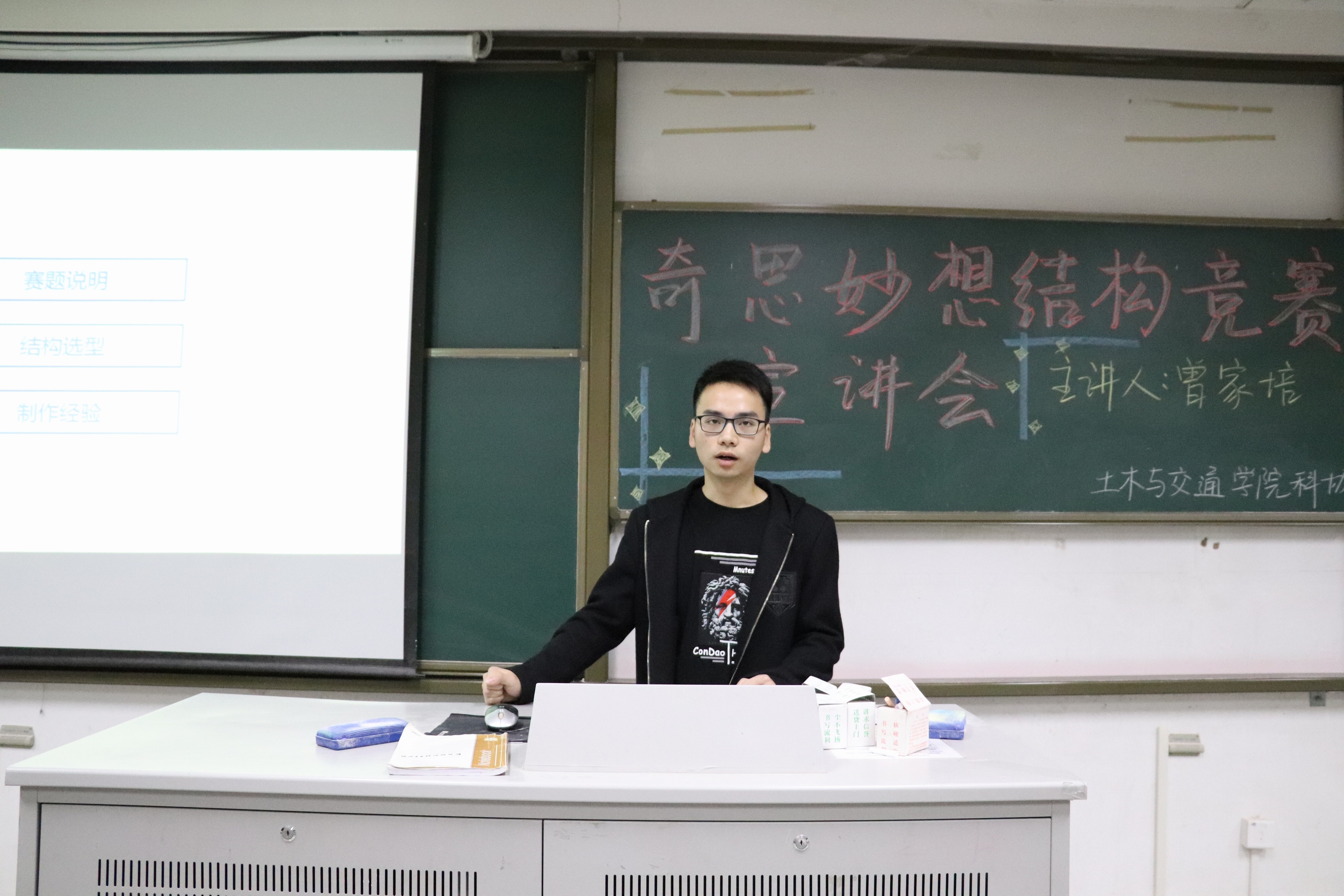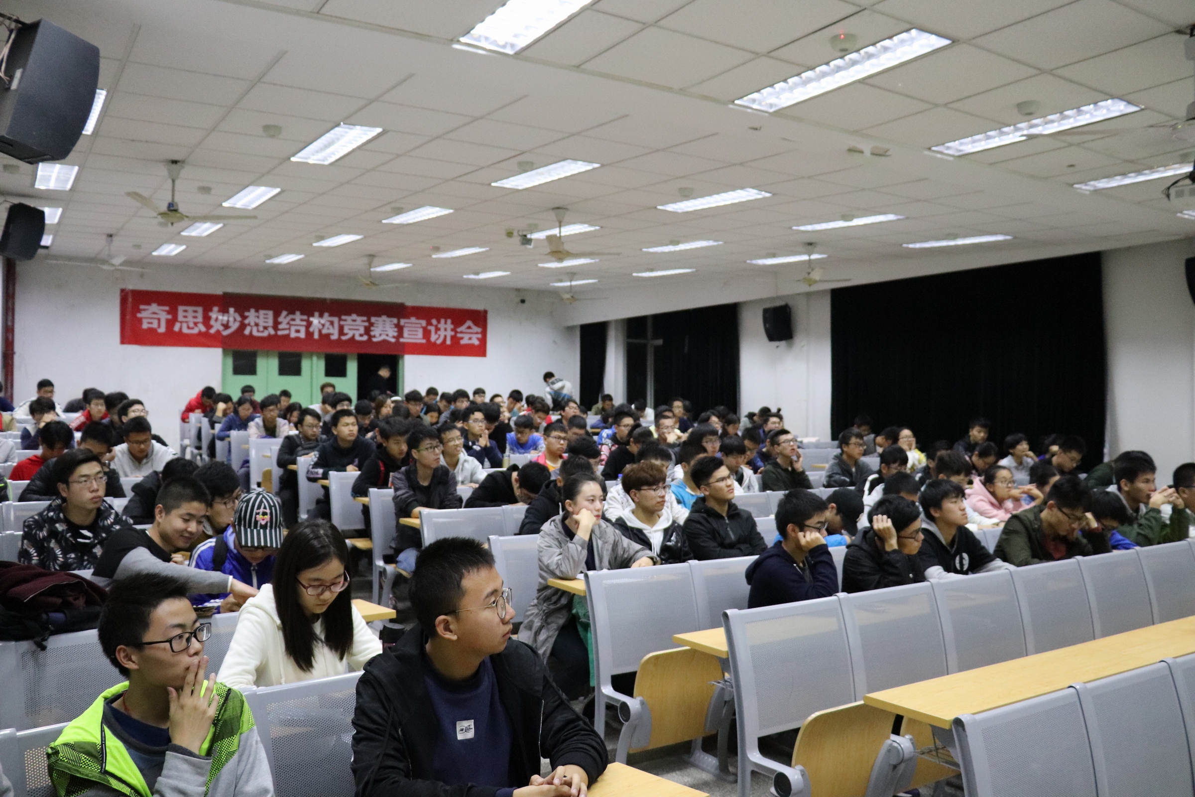 2017年11月10日晚6:30,由土木与交通学院主办,学院本科生科协承办的“第十届奇思妙想结构竞赛”宣讲会在江宁校区致用楼117顺利举行。本次宣讲会有幸邀请到曾获2016年江苏省大学生结构创新竞赛(加载组)二等奖、2017年美国土木工程师学会大学生土木工程竞赛钢桥赛(中太平洋赛区)季军的曾家培同学作为主讲人,此次奇思妙想结构竞赛的参赛同学和对结构竞赛感兴趣的同学聆听了本次宣讲会。