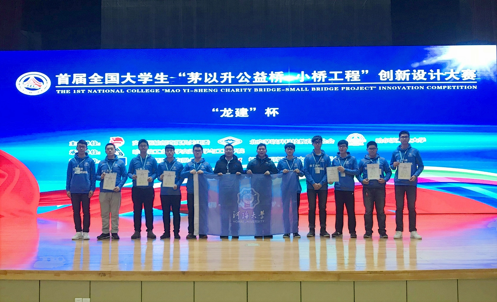 2017年12月8日至10日,首届全国大学生“茅以升公益桥——小桥工程”设计大赛在哈尔滨工业大学举办,我院选送的两件作品以所在答辩组第4和第6的成绩,分获三等奖。其中由2017级硕士生王强、2014级本科生林宏威与2015级本科生陈雨唐、曾豪、高天(指导教师:刘荣、汪传跃)完成的作品还获得社会实践优秀奖(全场仅3项),由2017级硕士生王亚军、2015级本科生马佳伟、何梓铭、唐瑞、孙沛钊(指导教师:袁爱民)完成的作品获得社会实践奖。