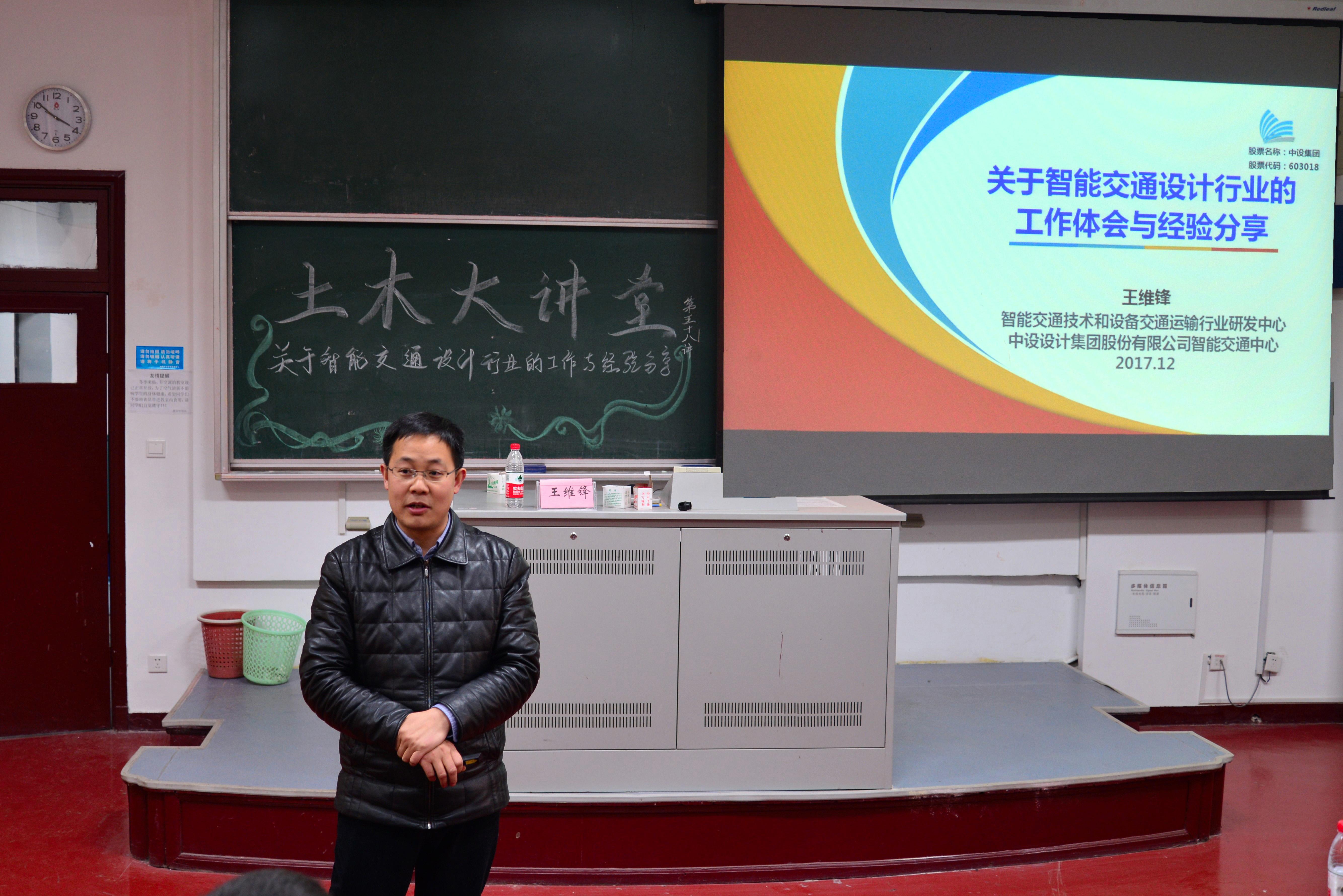 2017年12月11日,由土木与交通学院主办,学院本科生科协承办的土木大讲堂第五十八讲之“关于智能交通设计行业的工作体会与经验分享”在开云电竞网西康路校区成功举办。本次大讲堂邀请到了王维锋博士作为主讲人,王博士是现任交通运输部智能交通技术和设备交通运输行业研发中心常务副主任、中设集团智能交通设计研究中心主任,在智能交通设计领域有着丰富的经验。土木院沈扬副院长、交通系李锐副主任出席了本次讲座,2014级、2015级交通专业同学聆听了本次讲座。