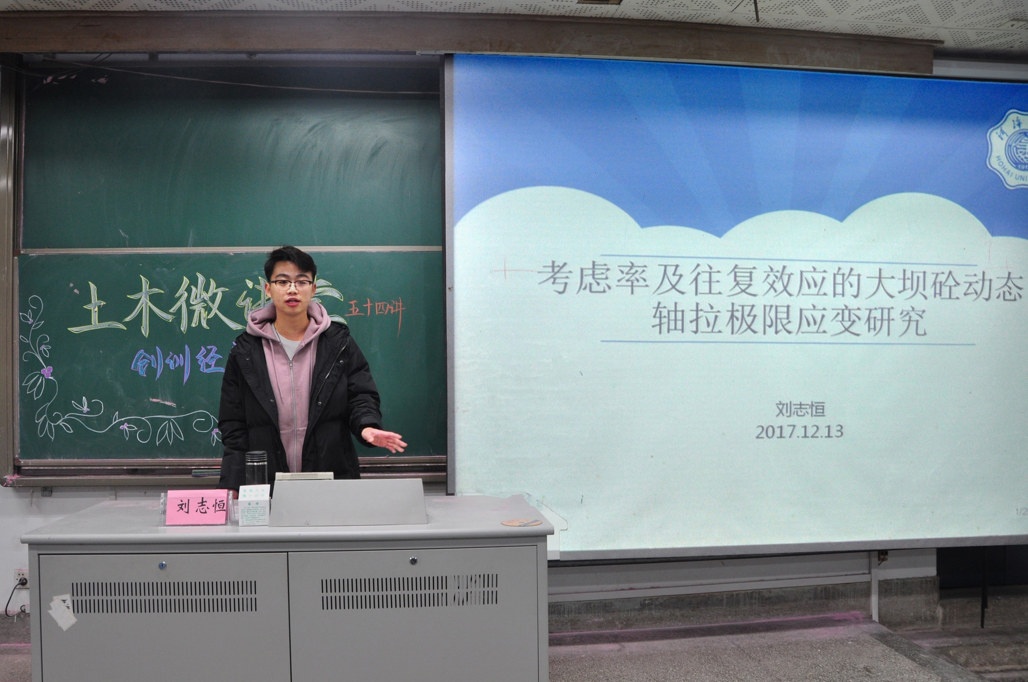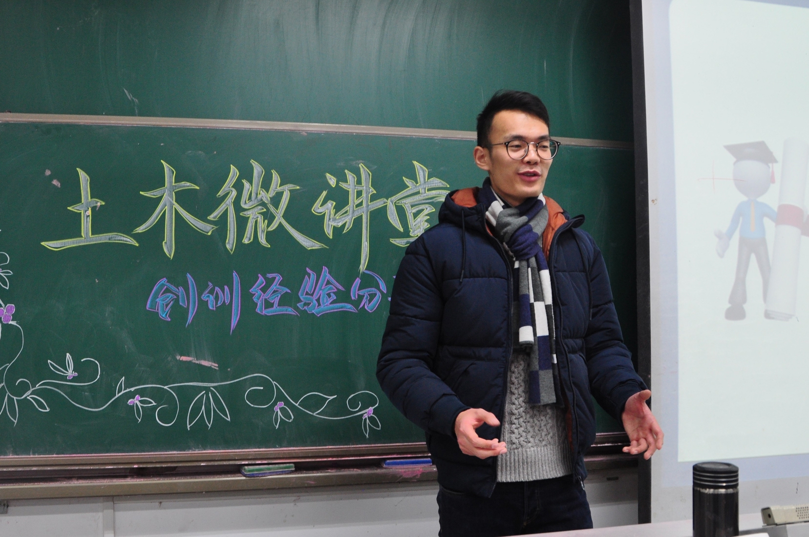 2017年12月15日下午6:30,由土木与交通学院主办,学院本科生科协承办的土木微讲堂第五十四讲之“创训经验分享”在开云电竞网校本部管理楼101室成功举办。本次讲座邀请到了2014级优秀学生王家超同学和刘志恒同学担任主讲人,两位同学在创训项目学习方面有着独到的经验。土木院2015级的部分同学聆听了本次讲座。