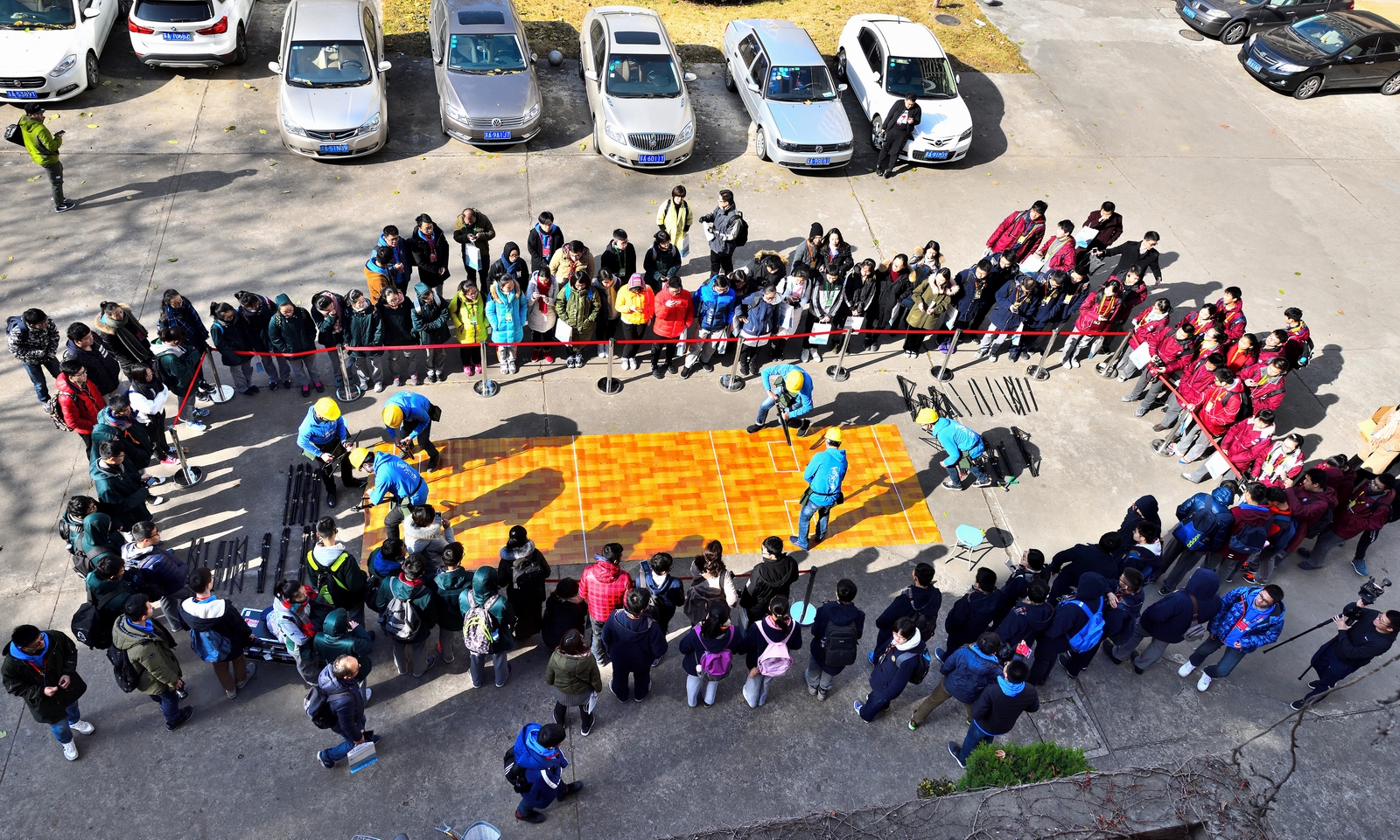 随后同学们前往科学馆前小广场,集中观看了2017年美国大学生土木工程竞赛中太平洋分区赛季军队的钢桥现场拼装表演。大学生们在短时间内搭建出精妙的钢桥结构,给同学们带来了巨大的视觉震撼,拼装完成后,同学们还纷纷坐在桥上,亲身感受钢桥的承重性能。
