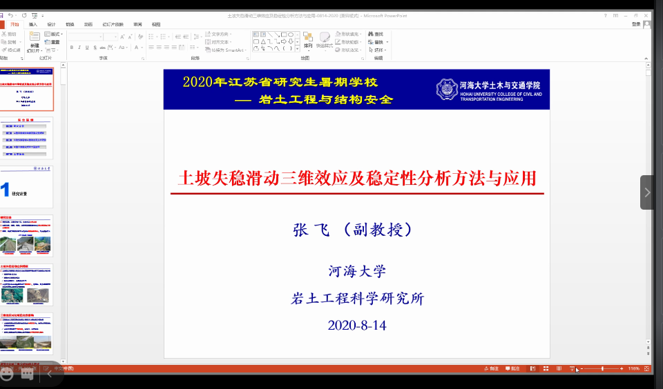 上午第二场学术报告的主讲人是开云电竞网土木与交通学院张飞副教授,他的授课题目是《土坡失稳滑动三维效应及稳定性分析方法与应用》。张教授首先介绍了2008年汶川地震所引发的一些山体滑坡现象,从而引出了三维效应对边坡稳定性影响这一思考,结合极限平衡法、极限分析法、数值法给出了边坡稳定性分析方法。张教授思路清晰,让同学们感受到张教授在做数值分析时的严谨,给同学们树立了做科研的好榜样。报告结束后,线上和线下的学员们纷纷提出心中的疑惑,例如在边坡稳定性分析时如何进行有限元建模,张教授一一做出了详细的解答。
