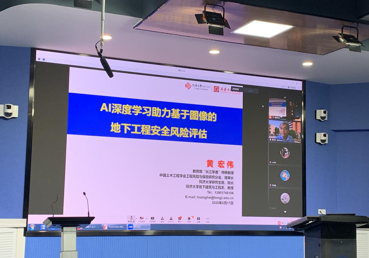 下午第一场报告的主讲人是同济大学土木工程学院黄宏伟教授,他的授课题目为《AI深度学习助力基于图像的地下工程安全风险评估》。黄教授向同学们讲述了工程中的安全风险挑战与AI应用的现状,介绍了国内外机器视觉设备的研发现状以及团队研究进展,向大家展示了基于图像的悬索桥锚碇剪切滑移的机理研究、基于深度学习的岩石隧道掌子面特征提取、基于机器视觉的隧道病害检测与健康诊断、盾构隧道探测注浆沉降风险控制方法等前沿研究成果。黄教授的报告内容丰富,观点新颖,引起了同学们的积极响应,对于同学们提出的盾构隧道探测的检测精度、深度学习的研发难点、数据训练的进行方式、学科交融问题的团队合作等问题,黄教授详细地做了解答。