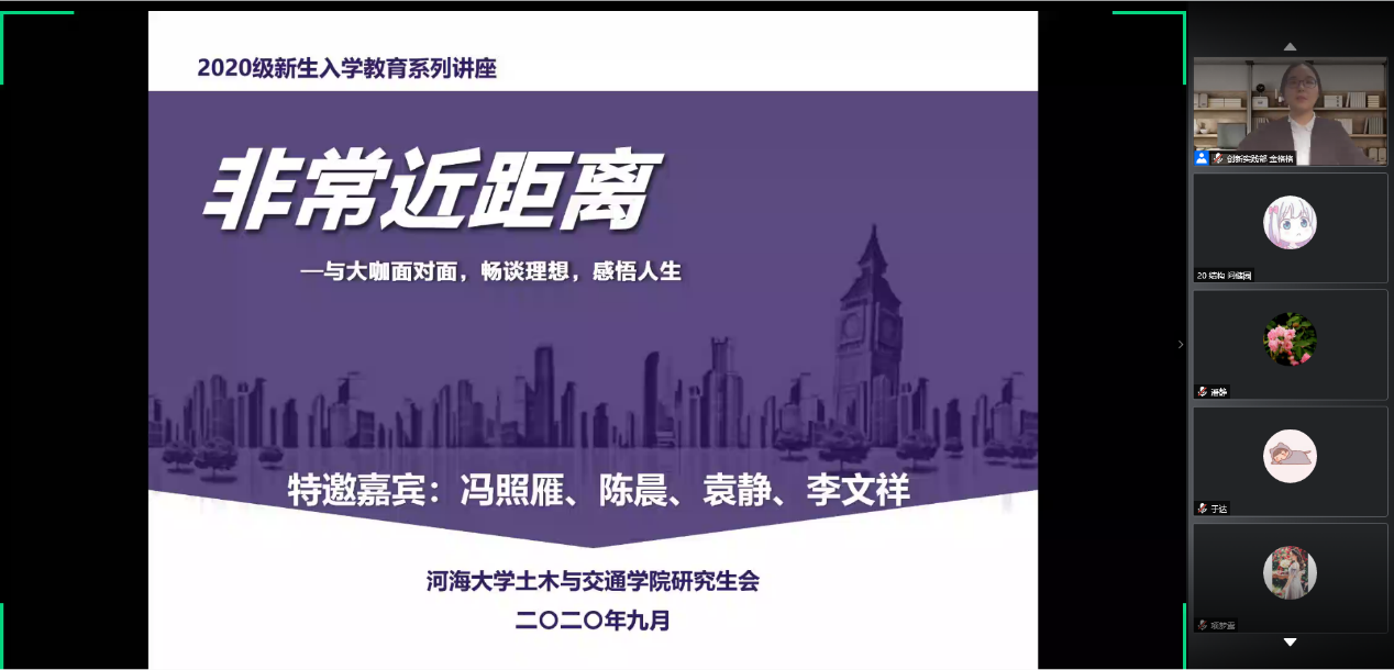 2020年9月23日,由我院研究生会主办的2020级新生入学教育系列讲座“非常近距离”访谈系列活动线上特别活动隆重举行。访谈嘉宾有幸邀请到我院土木工程专业优秀硕士毕业生冯照雁、陈晨、袁静、李文祥。我院部分本科生、研究生出席了这次线上活动。