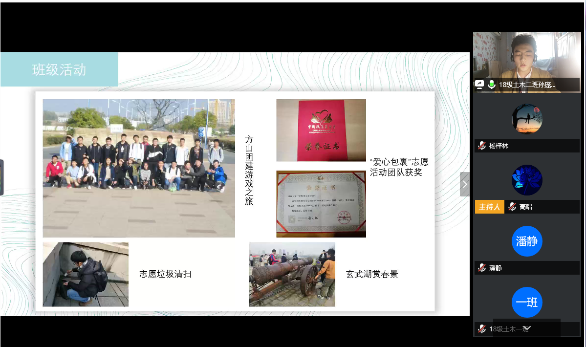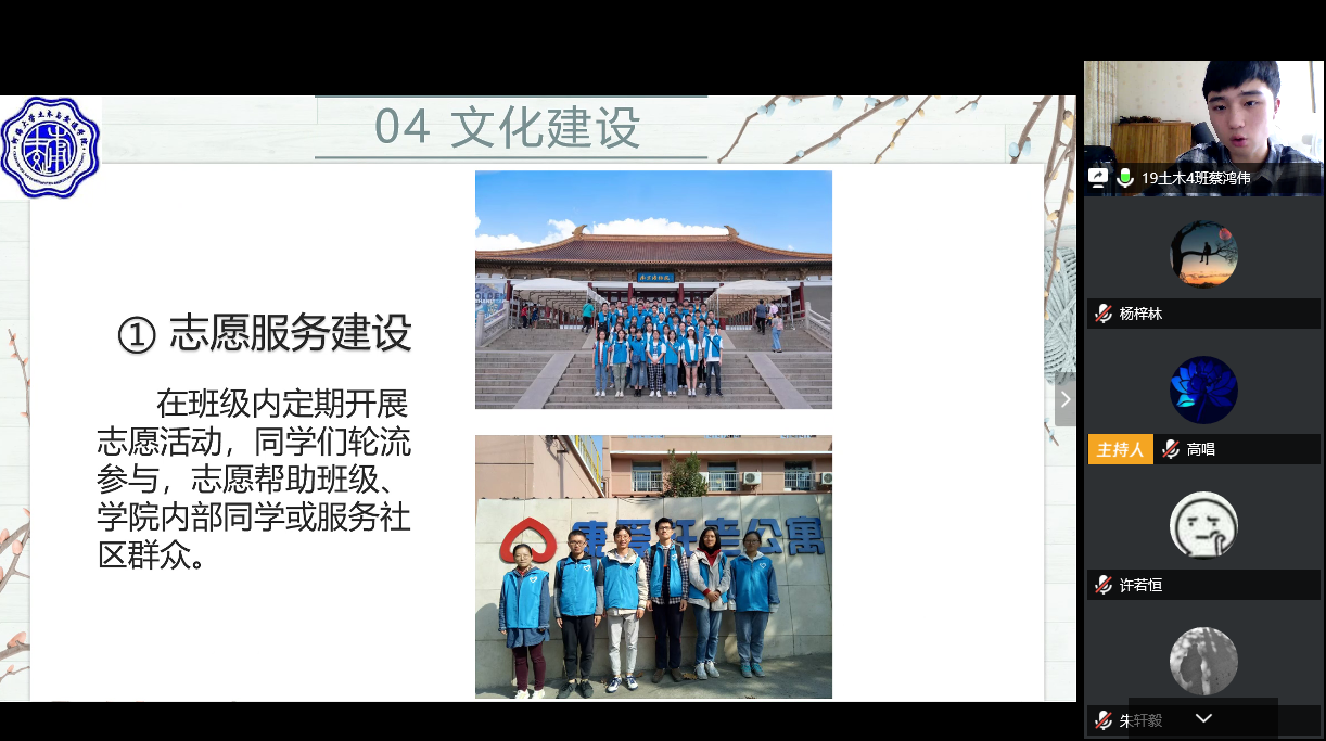 答辩正式开始,各班答辩人按照顺序依次对班级学风现状、创建计划以及预期目标和效果进行了阐述,各班从思想政治素质培养、学风建设、文明建设、制度建设四个方面详细介绍了班级的创建计划,有的班级还对疫情期间线上学习相应的督促机制和帮扶措施进行了分享。