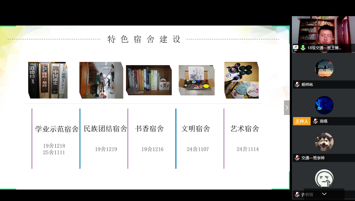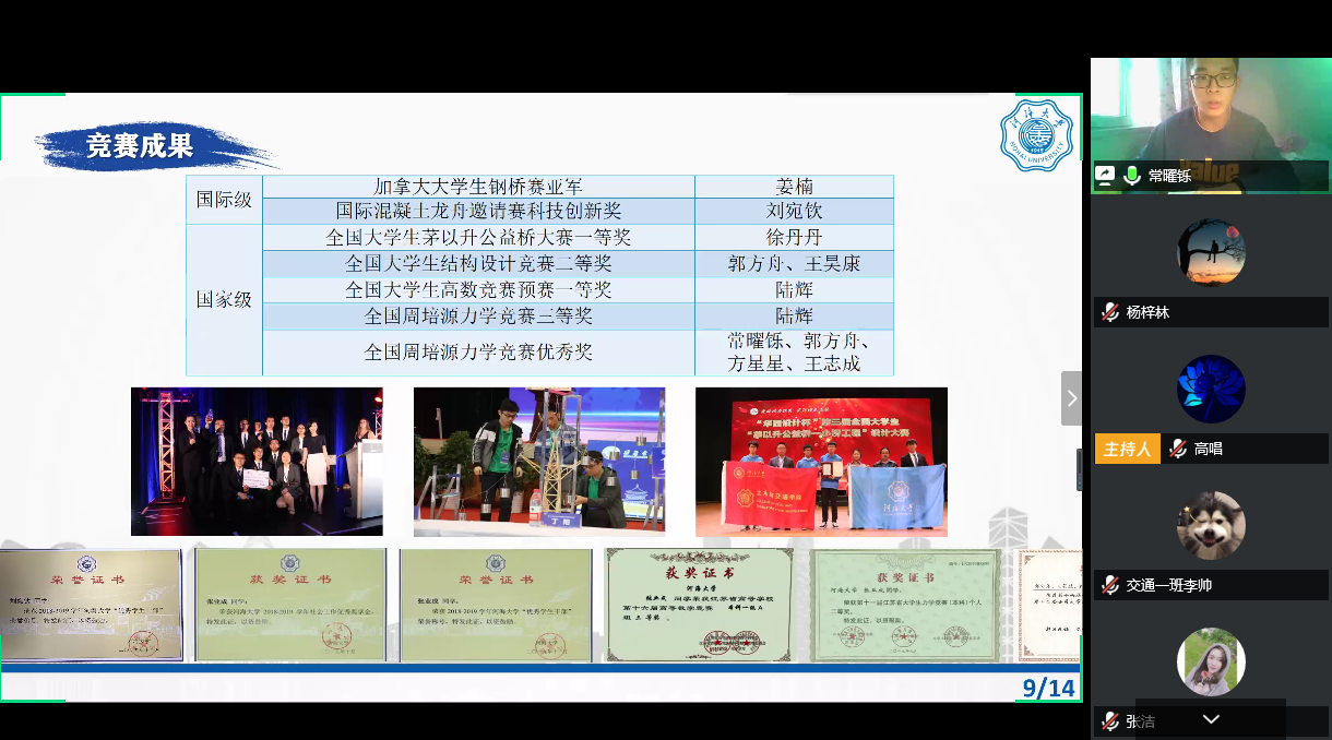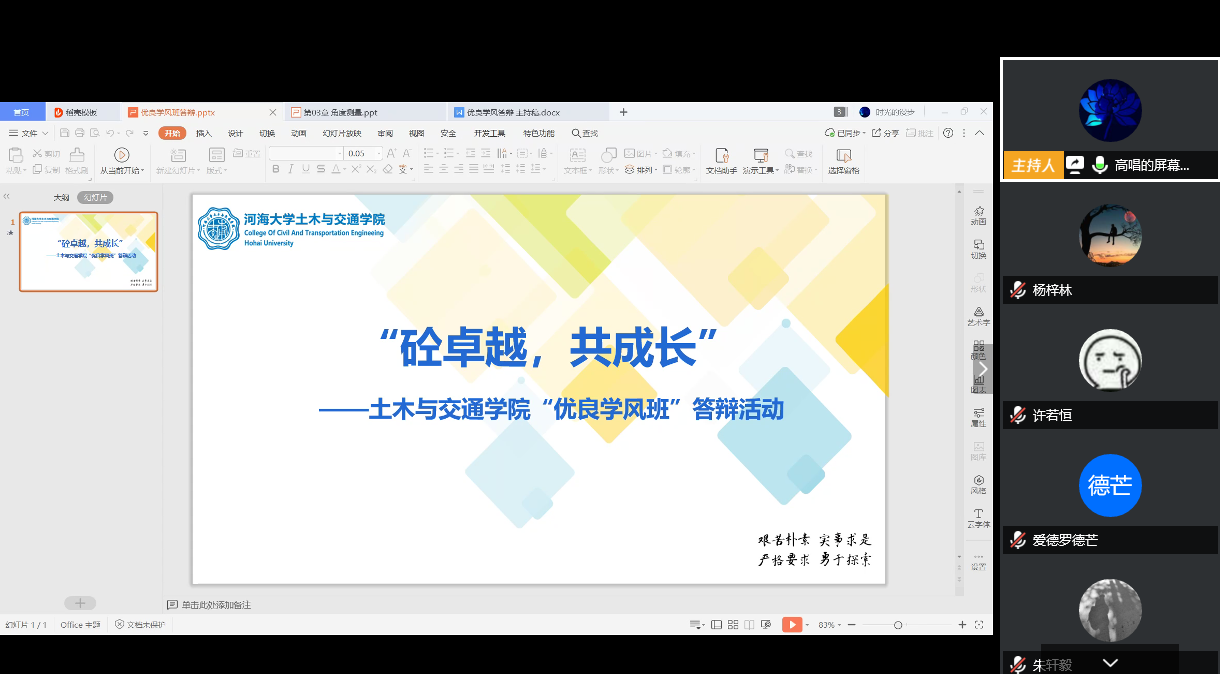 2020年4月29日15:30,由土木与交通学院主办、院本科生科协承办的“砼卓越,共成长”——2020年土木与交通学院优良学风班答辩活动在线上成功举办。本次答辩活动邀请到学院党委潘静副书记、学院教学副院长刘云副教授、土木系主任张华教授、交通系主任李锐副教授,17级班导师王海涛老师、胡少斌老师、张飞老师、李宁老师、赵星老师,18级班导师蒋勇老师、陈龙老师,19级班导师蒋建华老师、袁周致远老师、闵凡路老师、张沛老师,17级辅导员张洁老师、18级辅导员李倩老师、19级辅导员王璐老师担任评委,学院部分本科生参加了此次活动。