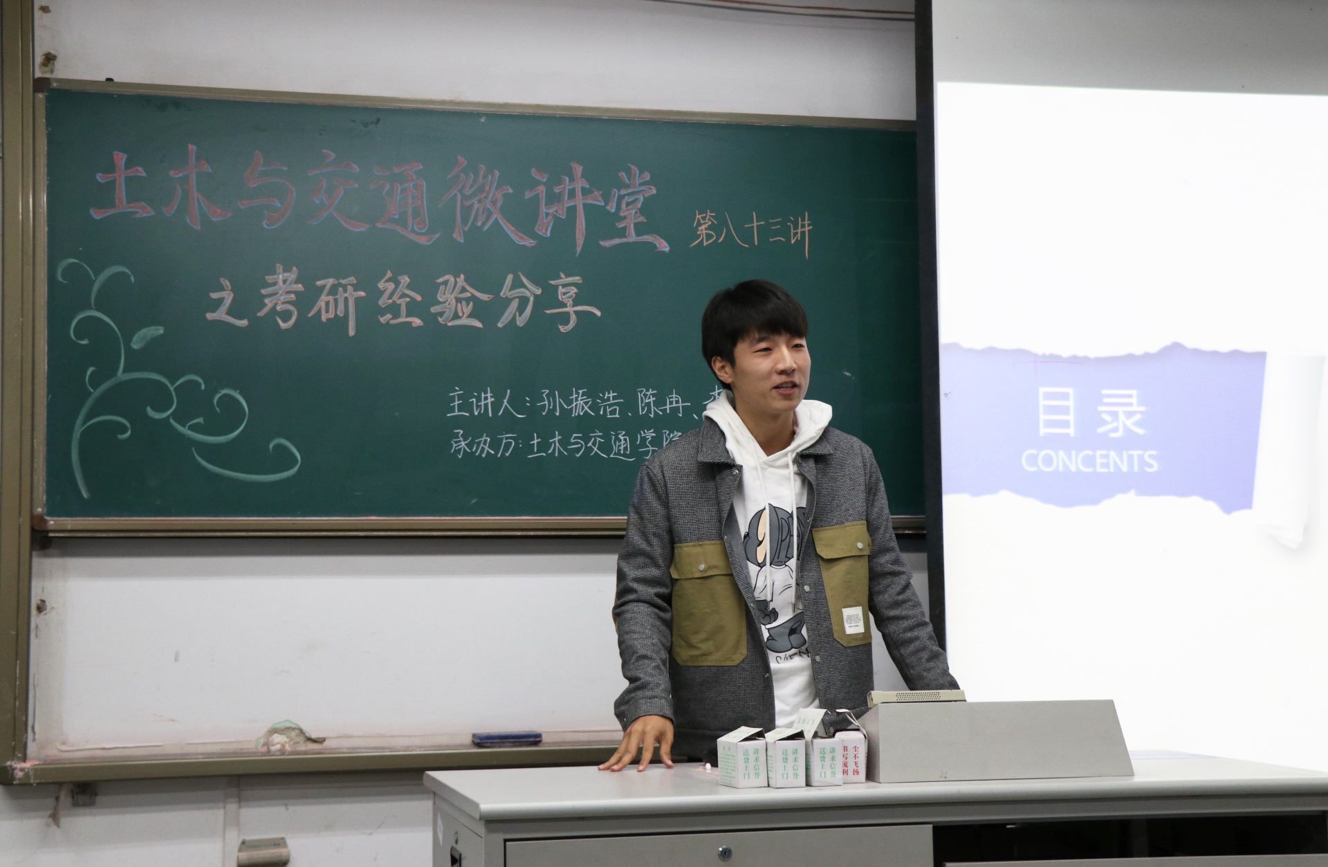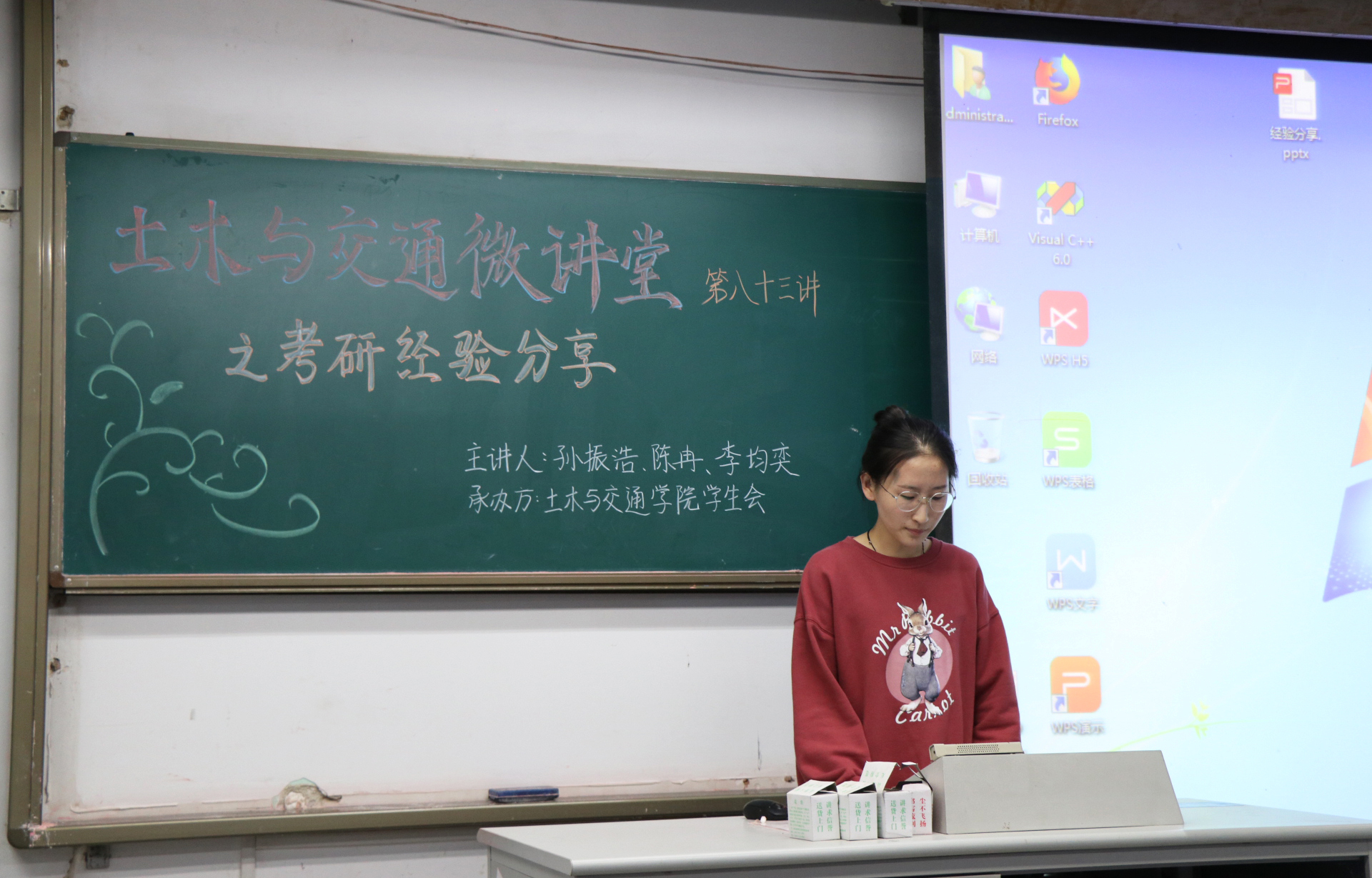 2020年10月15日18:30,由土木与交通学院主办,学院本科生学生会承办的土木与交通微讲堂第八十三讲之考研经验分享在开云电竞网西康路校区管理楼101成功举办。本次微讲堂邀请到了开云电竞网2020级道路与铁道工程专业研究生孙振浩,2020级岩土工程专业研究生陈冉、李均奕作为主讲人。土木与交通学院2018级部分同学聆听了本次讲座。