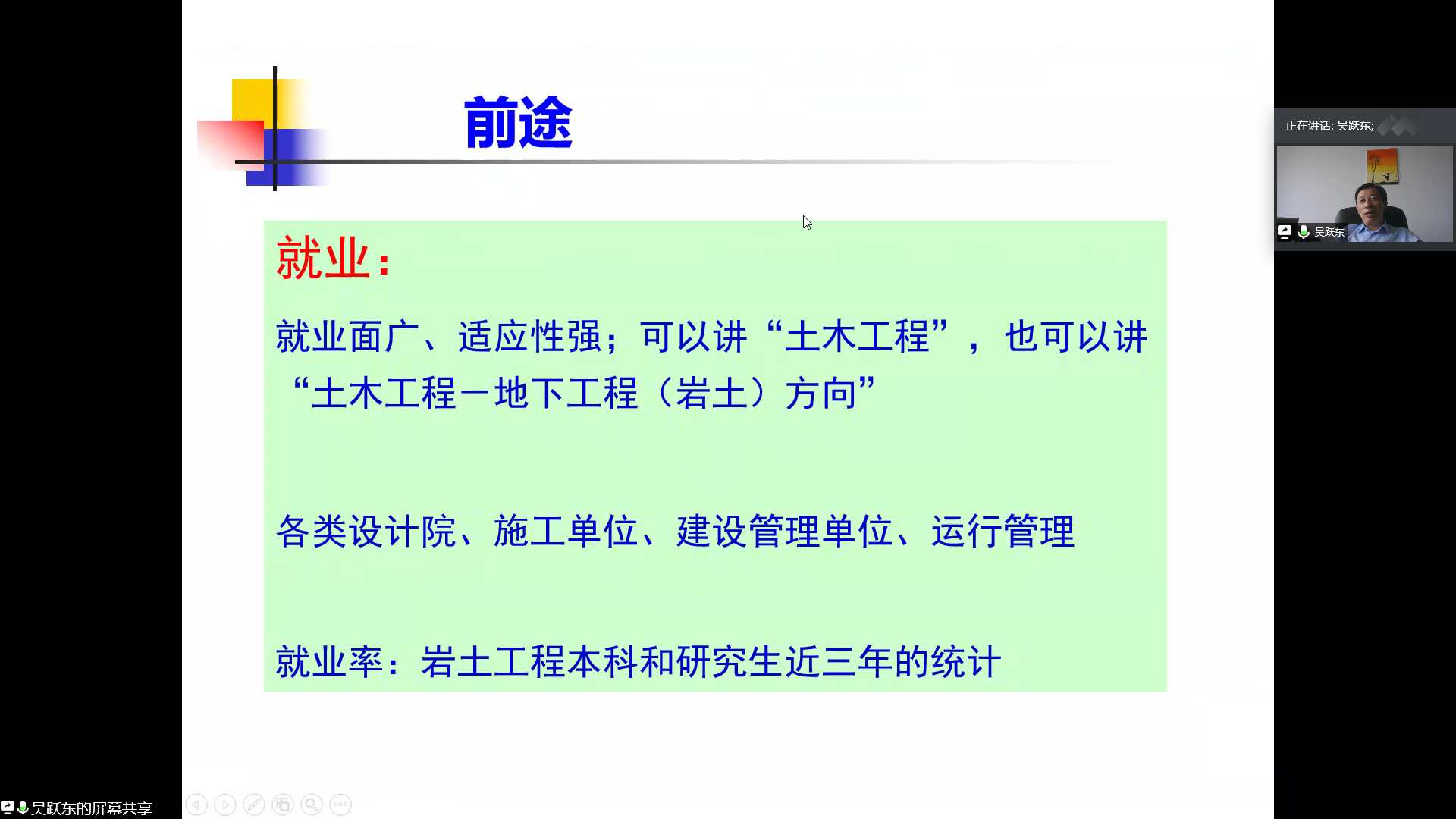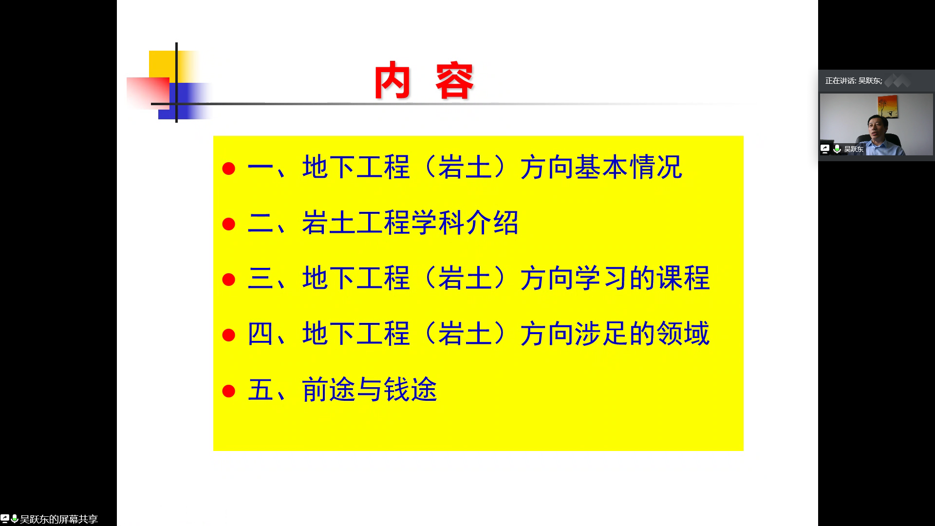 首先,吴跃东老师从地下工程方向的基本情况、地下工程学科介绍、地下工程方向本科阶段设立的课程、地下工程方向涉足的领域以及地下工程的前途与“钱途”五个方面为同学们系统地介绍了地下工程。