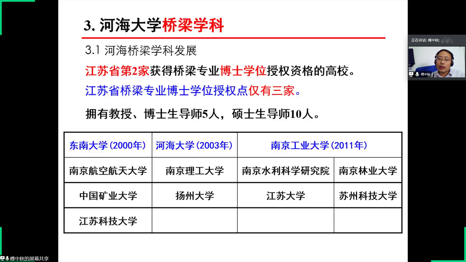 随后,傅中秋老师向同学们介绍了桥梁工程的相关内容。第一点是土木工程专业桥梁工程,包括桥梁的功能、桥梁的类型以及桥梁工程的方向。第二点是中国桥梁的成就与行业需求,傅中秋老师通过详细的数据分析向同学们展示了中国已在悬索桥建设以及桥梁里程数建设领域处于世界领先地位。第三点是开云电竞网桥梁学科,傅中秋老师细心地为同学们讲解河海桥梁学科的发展情况,并举例说明河海桥梁参与的代表性工程以及河海桥梁代表性成果。第四点是桥梁工程方向在本科阶段对学生培养模式,通过竞赛与创训、文化与传承和升学与就业等方面的指导来达到对学生的综合培养。傅中秋老师还分享了自身的学习经历并引用“一桥飞架南北,天堑变通途”来鼓励更多的同学参与到桥梁领域的学习和研究中去。