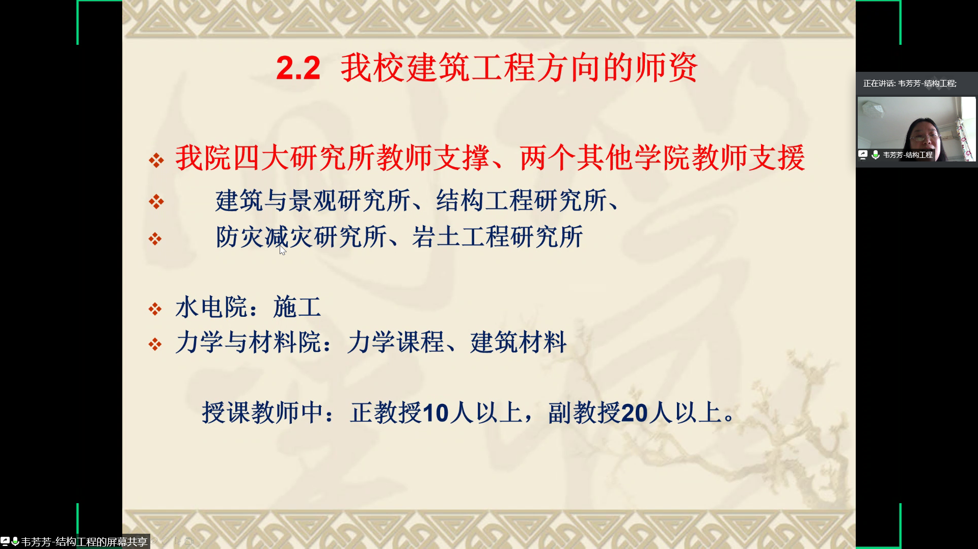 接着,韦芳芳老师在简述了土木工程专业的整体情况后对建筑工程方向进行了详细的介绍。建筑工程在本科阶段的课程主要分为理论课、实践课和选修课三部分,建筑工程方向的特点为包涵范围广、结构形式多姿多彩、工程量大、学习内容全面以及成就感强。韦芳芳老师同时介绍了建筑工程方向任课教师的基本情况、教学成果以及未来的发展方向。韦芳芳老师提到土木工程专业各方向之间是交叉、互补、融合与团结合作的关系,并鼓励同学们在专业分流时能够选择建筑工程方向,希望同学们能够成为更好的自己。