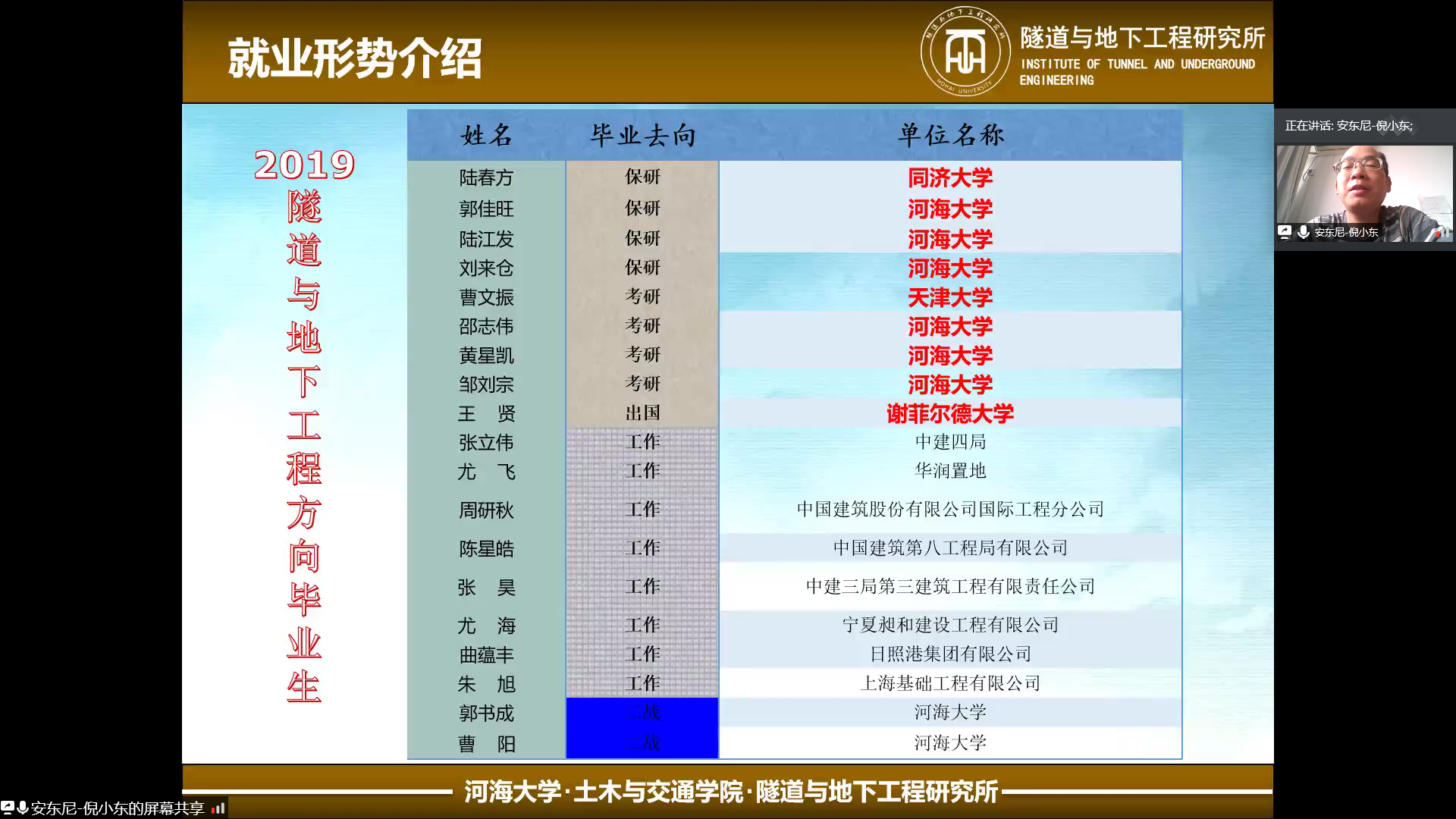 最后,由倪小东老师为同学们介绍隧道与地下工程。老师首先介绍了隧道与地下工程方向本科阶段的培养方案,并通过讲解地下工程的分类等方面详细介绍了我国隧道与地下工程的发展现状。紧接着倪小东老师又介绍了隧道与地下工程研究所的师资情况、重点研究方向和主要的科研课题。倪小东老师还分析了同学们最关注的隧道方向人才培养的成果以及就业形势。通过老师的介绍,同学们对隧道工程有了更加全面深刻的了解和认识。