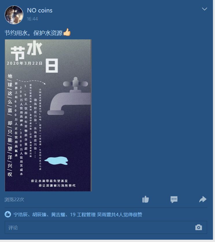 3月24日至29日,同学们创作并提交了自己的作品,之后作为节水宣传志愿者,在线上将自己的作品发布至QQ空间/微信朋友圈,并配上与节约用水相关的文字,起到了节水公益宣传的效果。