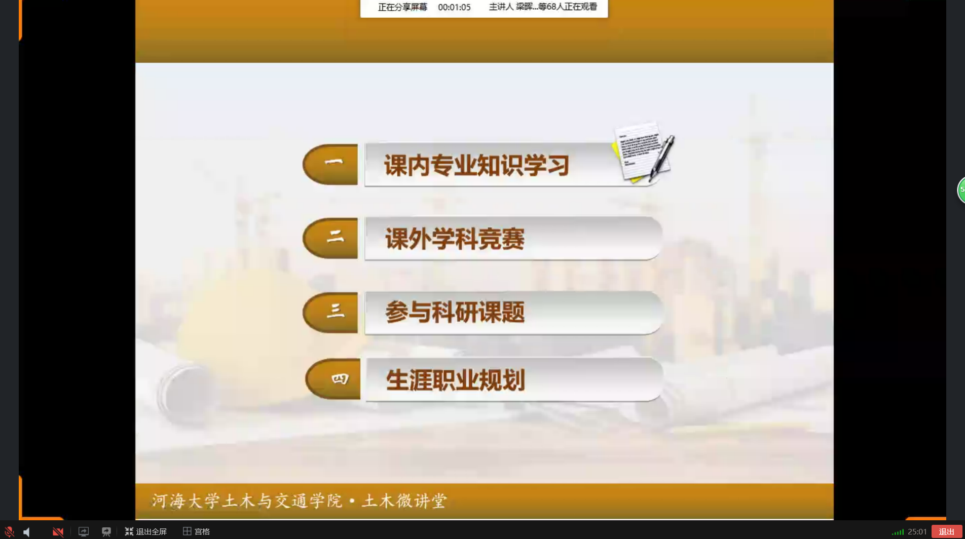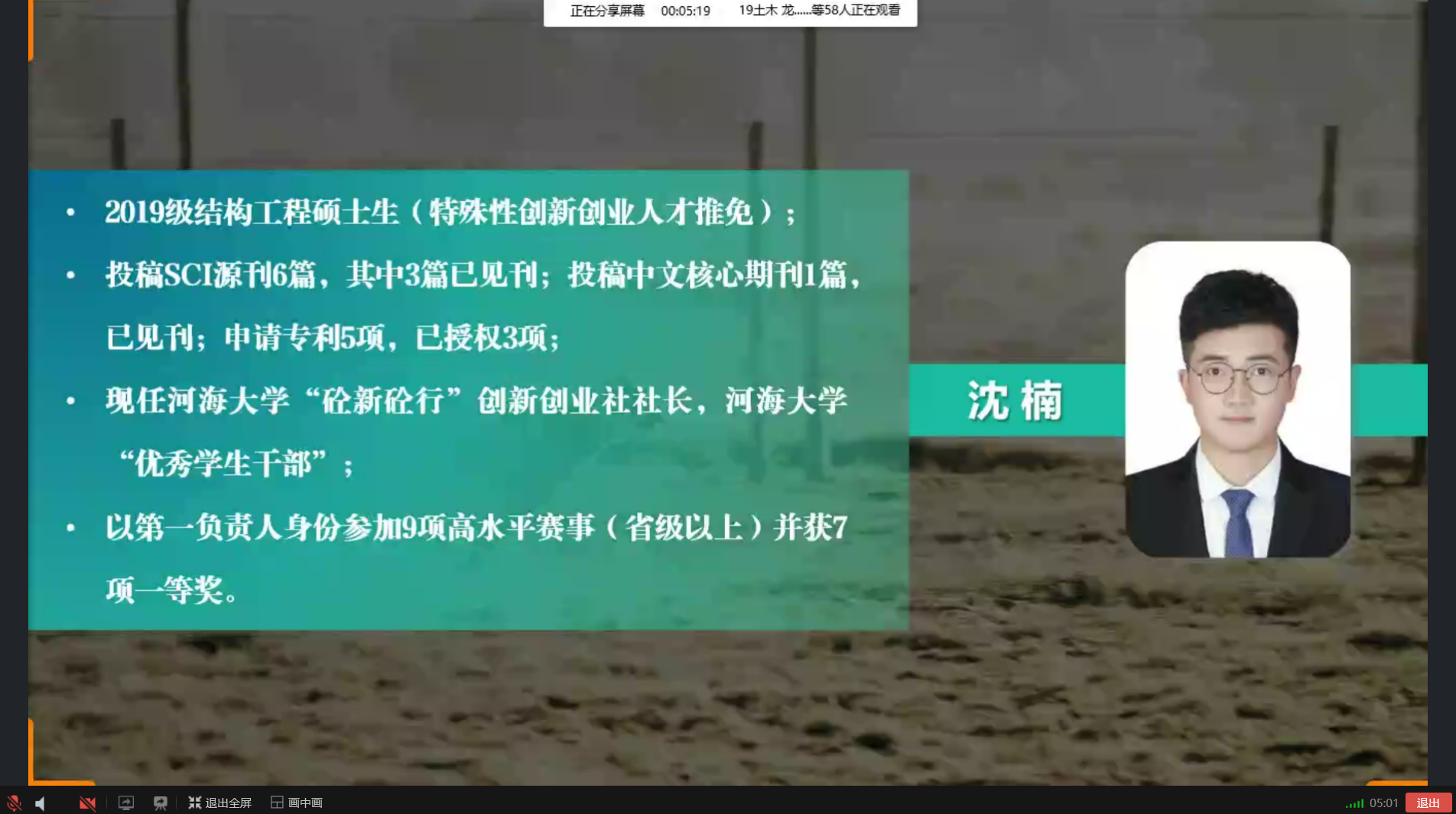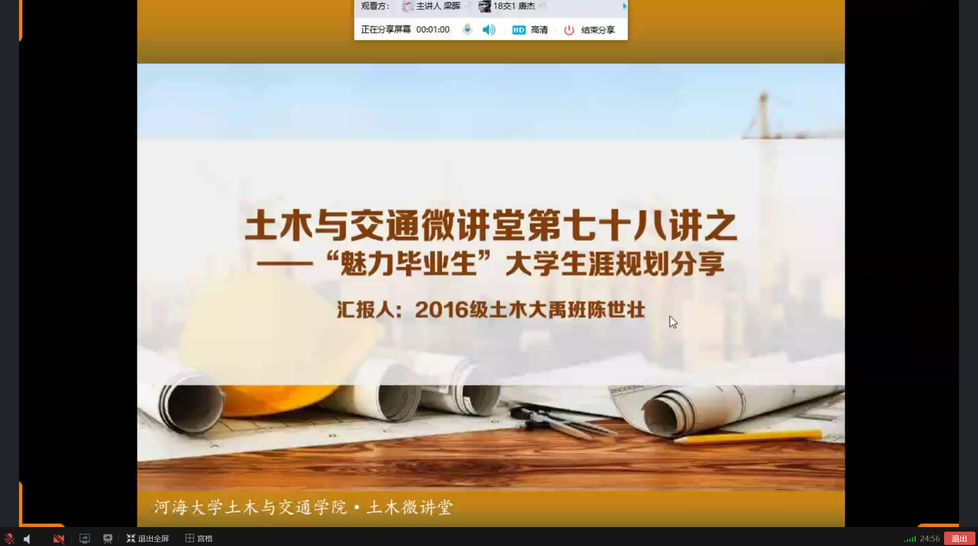 2020年6月13日18:30,由土木与交通学院主办,学院本科生科协承办的土木与交通微讲堂第七十八讲之“魅力毕业生”大学生生涯规划分享成功举办。由于疫情原因,本次微讲堂仍采用云直播的方式进行。本次微讲堂有幸邀请到土木与交通学院结构工程专业2019级硕士研究生沈楠、黄业博,土木大禹班2016级本科生陈世壮作为主讲人。土木与交通学院2018和2019级部分学生聆听了本次讲座。