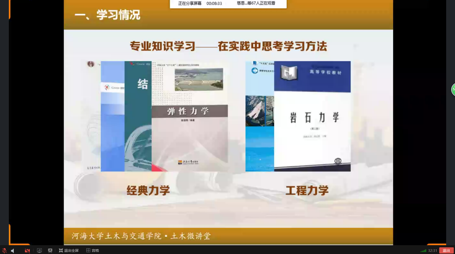 接下来,陈世壮同学从四个方面向同学们分享了自己的生活和学习经验。首先,陈世壮同学强调了课内专业知识的学习。对于基础学科的学习,需要同学们在枯燥中寻找学习规律,并以高等数学和计算机语言为例,讲述了自己的学习方法和技巧。而对于专业知识的学习,需要同学们在实践中思考学习方法,并通过介绍自己在经典力学和工程力学两类专业知识上的学习方法,提供给同学们很多有用的建议。随后,陈世壮同学从基础学科竞赛和专业类竞赛两个方面,介绍了竞赛的种类。并且告诉同学们要结合自身实际,理性地选择并参加适合自己的学科竞赛。之后,陈世壮同学向同学们展示了创训与专利以及科技竞赛的成果,鼓励同学们参与科研课题。陈世壮同学还分享了自己的保研经历,同时向同学们介绍了各个高校土木专业的特色和保研细节,给同学们的生涯职业规划提供了很大的帮助。
