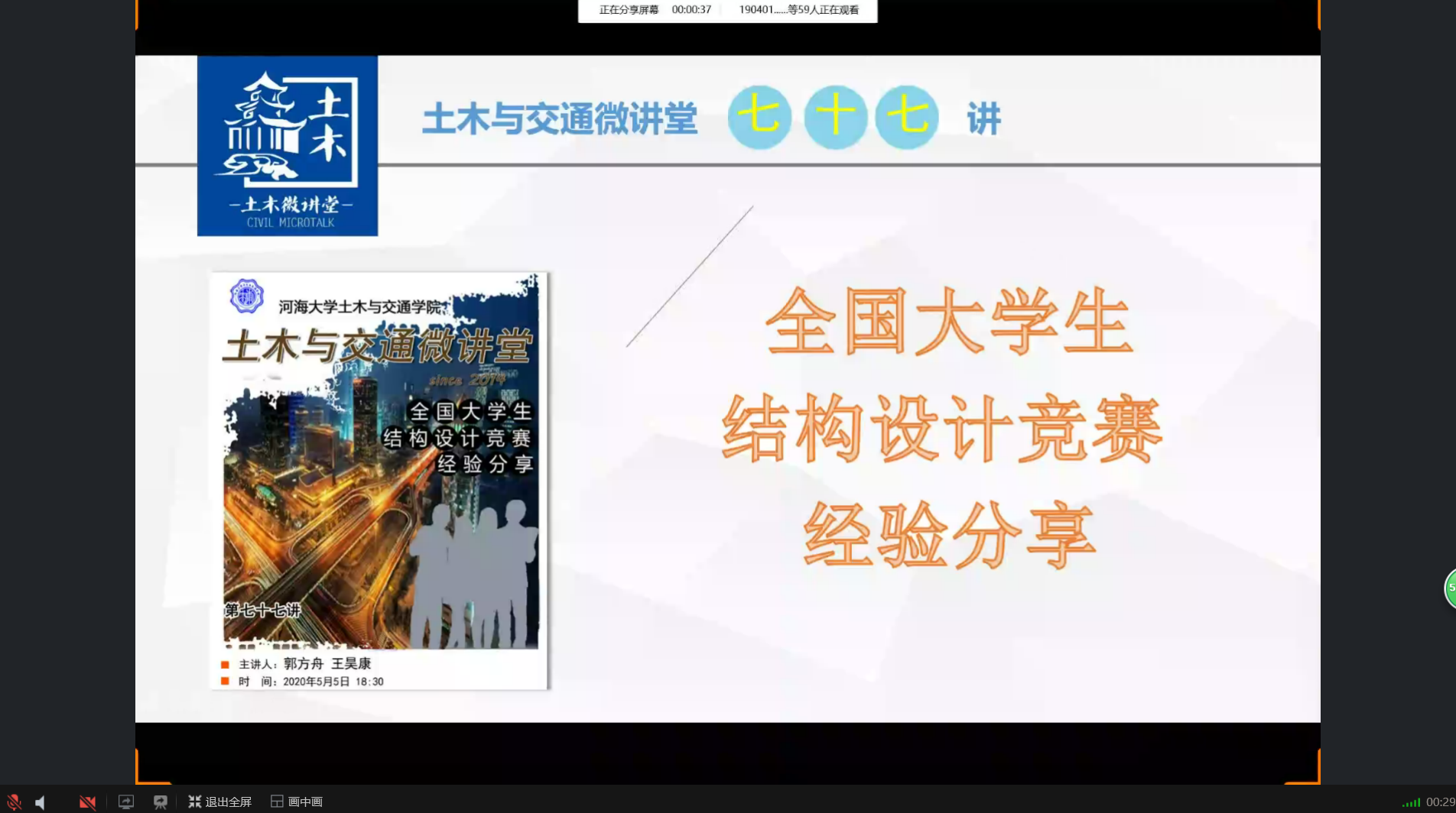 2020年5月5日18:30,由土木与交通学院主办,学院本科生科协承办的土木与交通微讲堂第七十七讲之“全国大学生结构设计竞赛经验分享会”以线上直播的方式成功举办。本次微讲堂邀请到了2017级土木工程结构方向本科生郭方舟和王昊康同学为大家带来经验分享。土木与交通学院17、18和19级部分学生聆听了本次讲座。