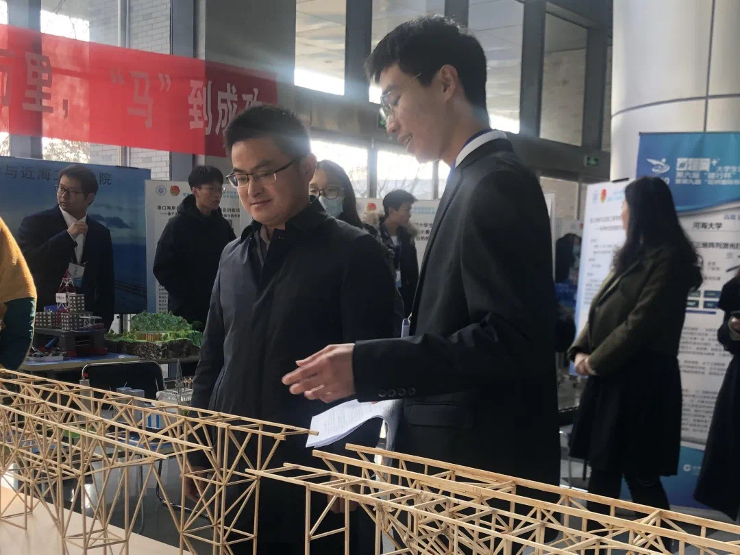 在土木与交通学院的展示台上,展出了我院学子在第十三届“奇思妙想”结构设计竞赛中的四组获奖作品,开云电竞网团委副书记朱乔到我院展台参观,志愿讲解员为朱书记和在场同学介绍了获奖模型的设计理念以及受力原理。前来参观的同学都为木桥的自重之轻以及承重之大赞叹不已。