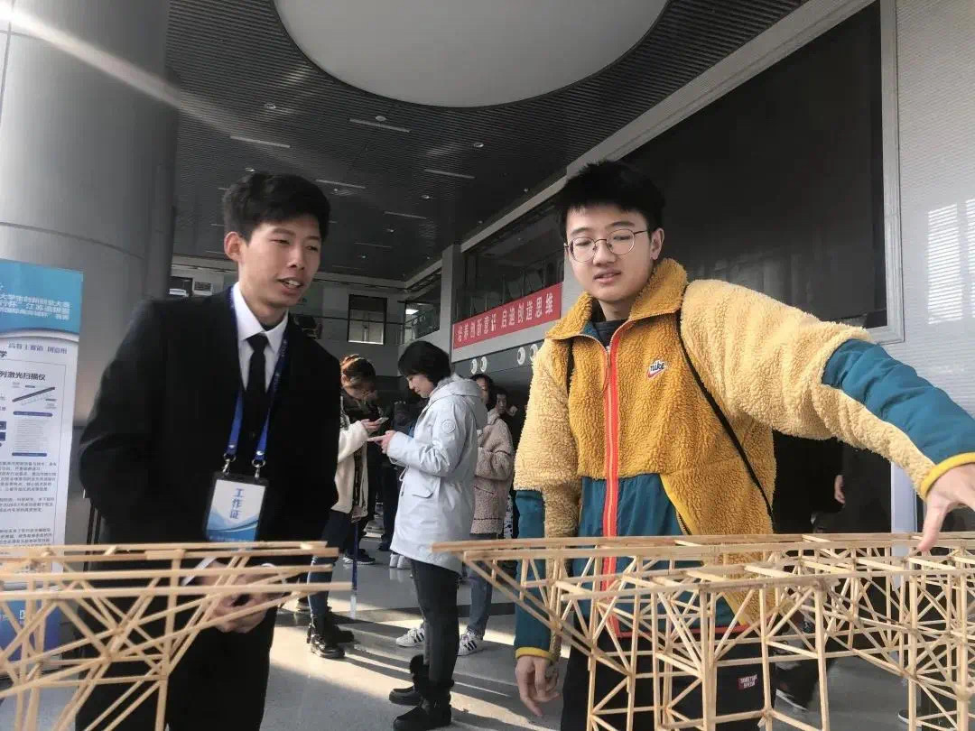 2019年加拿大全国大学生土木工程竞赛钢桥赛中荣获综合亚军的钢桥模型吸引了同学们的目光,讲解员为同学们介绍了钢桥的结构特点、承重原理以及制作过程,让同学们在欣赏的同时也能学习到专业知识,体会到这些模型的来之不易。
