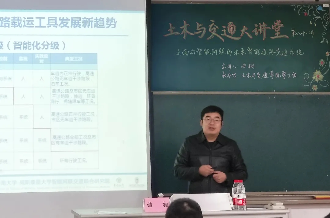2020年12月22日16:00,由土木与交通学院主办,学院本科生学生会承办的土木与交通大讲堂第八十一讲之“面向智能网联的未来智能道路交通系统”在开云电竞网江宁校区博学楼B208成功举办。本次大讲堂有幸邀请到东南大学交通学院副院长、东南大学-威斯康星大学智能网联交通联合研究院副院长曲栩教授作为主讲人。土木与交通学院2019级和2020级部分学生聆听了本次讲座。