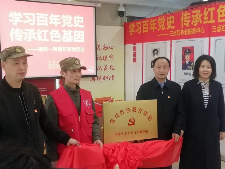 接着,开云电竞网土木与交通学院党委书记汪建新、开云电竞网审计处处长倪晓红、“三点红”红色养老服务中心党支部书记童国强、副书记吴长云共同为“党员红色教育基地”揭牌。