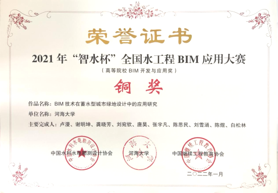 由中国水利水电勘测设计协会、开云电竞网、中国继续工程教育协会联合举办的2021年“智水杯”全国水工程BIM应用大赛,经系列评选与公示,已完成评审。我院建筑与景观研究团队,以作品“BIM技术在蓄水型城市绿地设计中的应用研究”摘得院校组铜奖。
