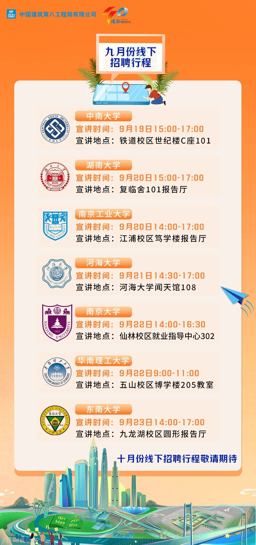 中建八局2023届秋季校园招聘九月行程安排及各子企业招聘信息合集