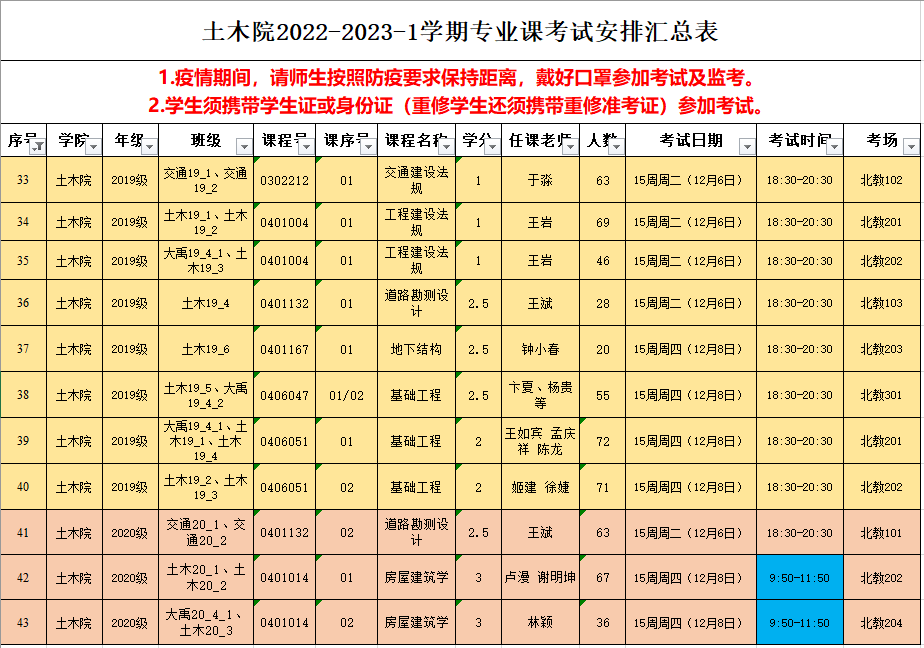 土木院2022-2023-1学期专业课考试安排(第15周)