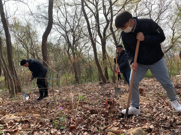 栖霞山北面山坡上,31名团员青年分工合作,挥锨培土、回填踩实、提桶浇水,栽下鸡爪槭15棵树苗,以实际行动倡导植绿护绿爱绿的良好风尚。为纪念本次活动,所有团员青年还共同种下一棵友谊之树。