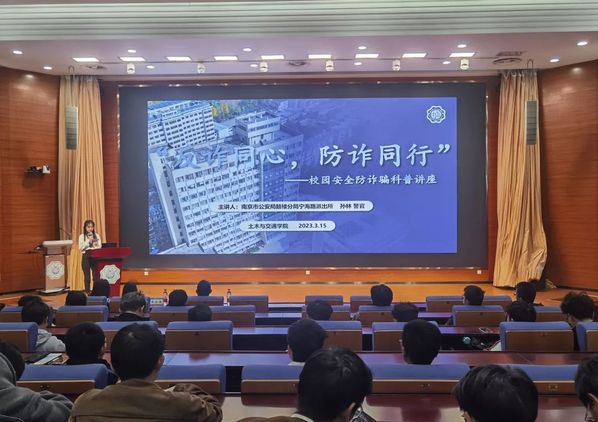 为全面做好防范电信诈骗宣传工作,有效遏制电信诈骗案件的高发态势,提高大学生的安全防范意识,2023年3月15日18:30,由土木与交通学院主办,学院团委承办的校园安全防诈骗科普讲座在西康路校区科学会堂301成功举办,本次活动邀请了南京市公安局鼓楼分局宁海路派出所孙林警官,保卫处治安科朱长婕老师、学院团委副书记李倩老师以及学院部分本科生参加了本次活动。