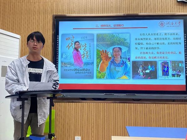 首先由董子昂带领同学们学习党的二十大精神,讲述新时代土木青年的使命与担当,多个方面讲述了当下土木青年如何去树立自己的人生观和价值观,如何具体地践行党的二十大精神。接下来,由曾慧程、王贺召、黄子桓三位同学分别向同学们讲述了雷锋、徐秀娟、黄文秀三位青年榜样的感人事迹。