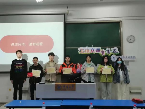 在演讲结束后,土木与交通学院团委江宁负责人韩雪以及青年发展部副部长刘文豪为五位主讲人颁发荣誉证书并赠送精美礼品。