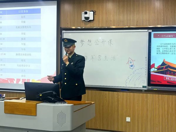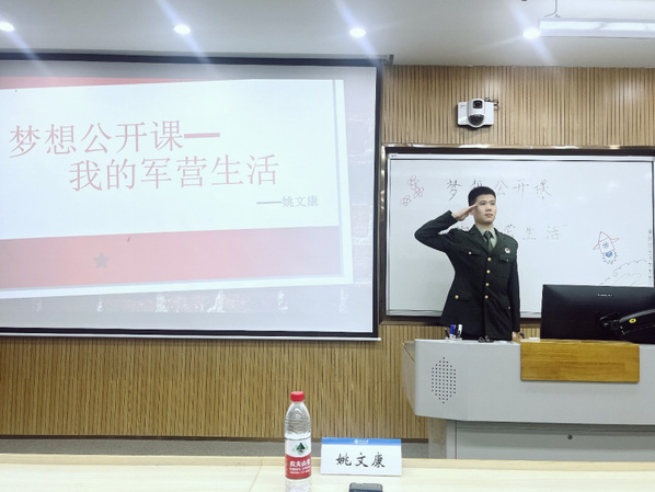 风华正茂之际,携笔从戎之时。从美丽的校园步入整齐划一的军营,是梦想,是勇气,是奉献。在部队这个大家庭里百炼成钢,无悔选择,无悔青春。他们复学后也将继承和发扬中国军人的光荣传统,用自身的成长历程和模范行动为身边的同学做好表率。最后,主持人黄培钧同学表达了对军人队伍的赞美,在同学们的掌声中宣布本次梦想公开课的结束。
