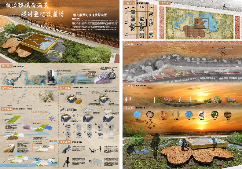 装置组作品“桐边静观黄河景,水岸欢忆兰考情——铜瓦厢黄河改道模拟装置”以兰考铜瓦厢黄河改道与焦裕禄种植泡桐的历史故事为设计背景。在设计手法上,强调景观性与互动性。景观性上,以景观花溪与改道装置平台两部分组成黄河完形,改道装置台面呈现实际自然地形,以景观花溪、池塘与上人木平台组成桐花完形,是装置的同时也成为东坝头上的一处景观。互动性上,设计阿基米德取水器的传动结构,随游客的操作,从花溪中汲水的同时将周期切换模拟流水台面上的河道,形象地展示黄河改道过程。
