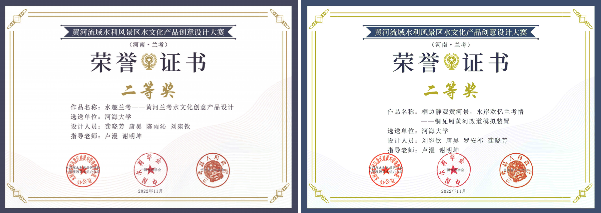 2023年4月15日,2022年黄河流域水利风景区水文化产品创意设计大赛(河南·兰考)颁奖典礼在兰考黄河水利风景区举行。本次大赛在启动后全国共提交研学旅行课程设计、文创产品设计和文化科普装置设计作品144组,评出“研学组”“文创组”“装置组”三个类别作品一等奖各1名,二等奖各3名,三等奖各5名,优秀奖各5名。我院建筑与景观研究所团队,以作品“水趣兰考——黄河兰考水文化创意产品”“桐边静观黄河景,水岸欢忆兰考情——铜瓦厢黄河改道模拟装置”分别获得文创组与装置组二等奖。