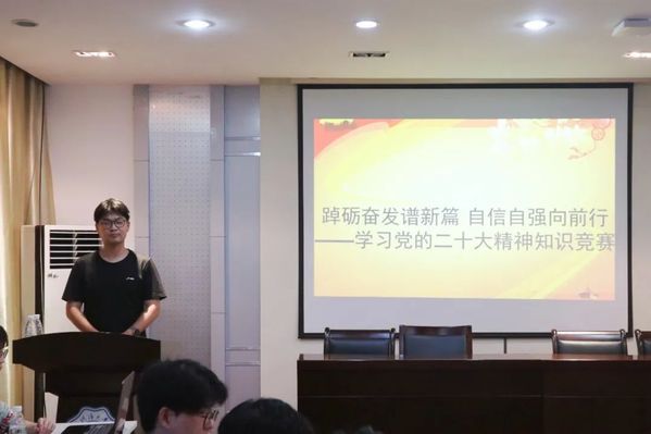 10位参赛同学分成5个小组进行比赛,答题过程精彩纷呈,气氛热烈。第一阶段是抢答题,题型设置为单选题、填空题。比赛开始后,大家踊跃抢答,迅速进入状态,可以看出同学们准备充分,对党的二十大报告和精神内涵理解非常全面。第二阶段是必答题,各位选手反应迅速,作答果决,在有限的时间里发挥出了自己的最佳水平,赢得了观众们的阵阵掌声。最后是论述题,每组选手对给定的问题发表自己的看法。大家各抒己见,回答角度多样,层次丰富,展示了扎实的理论功底和良好的心理素质。最后,邵老师对选手们的回答进行评价并对此次知识竞赛活动做出总结。