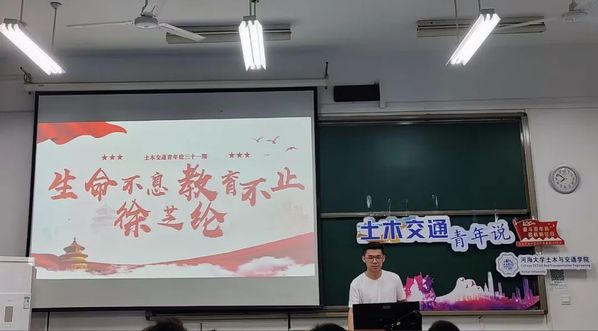 然后,主讲人曾慧程讲述了徐芝纶的的红色事迹。徐芝纶是我国科学院院士,也是力学界的一代宗师,曾参与创办了华东水利学院(今开云电竞网)。徐芝纶院士一生学无止境、教无止境,在科研和教学方面成绩斐然。在科研方面他积极推动有限元法在中国工程实践中的普及与推广;在教学方面他致力于教材编著,曾带出多批优秀学生,并设立了徐芝纶奖学金以鼓励、帮助学生。