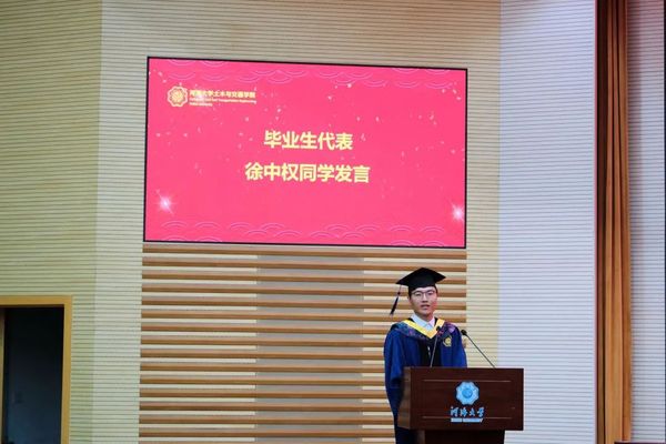 研究生毕业生代表徐中权同学发言,他首先表达了对学院老师最真挚的感谢,三年的科研与竞赛生涯中,老师们严谨认真的作风、勇攀高峰的精神、不忘初心的情怀是教给大家最重要的一课。希望同学们无论在什么工作岗位,都能够担当起复兴中华的时代重任,把个人梦想融入到中华民族伟大复兴的中国梦中。