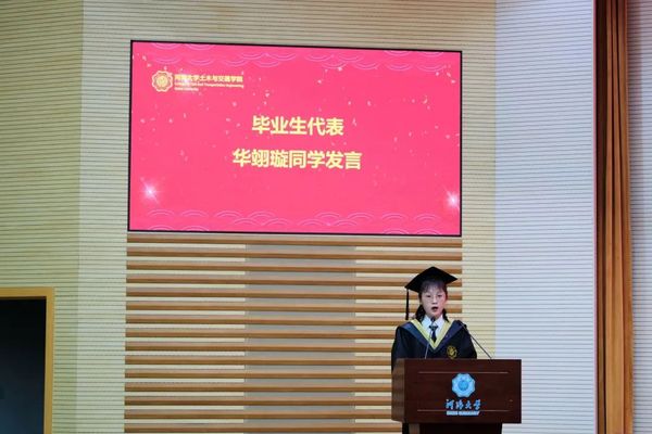 本科生毕业生代表华翊璇同学发言,回顾从迷茫懵懂到坚定成熟的四年本科生活,华同学总结出目标和执念是驱使她不断挑战自我并逐渐进步的秘诀。在今后的前进道路上,将始终谨记母校的陪伴与叮咛,扬起风帆,奔赴前程。