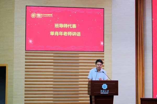 班导师代表单肖年老师发言。单老师建议同学们要常怀进取的心、铭记感恩的心、学会平常的心。选择适合自己的道路,坚定地走下去。知足常乐,珍惜年轻的美好时光,珍惜身边的人和事,在未来的工作和学习中保持良好的心态,积极面对新的挑战,最终实现人生目标。