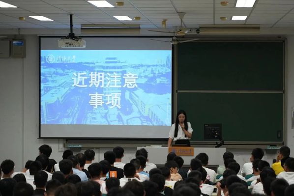 辅导员老师在年级大会上从大学的学习、生活、安全、入学启航周、纪律等方面进行介绍,指出大学学习的重要性,并对军训事宜作了规范与强调。