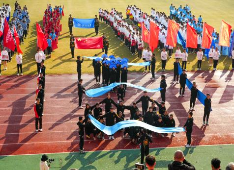 入场仪式后,迎来了“幸福河海”团体操表演。同学们踏着青春的曲调,依着默契的配合,队形流转变化之中,尽显河海学子的意气风发。挥舞的蓝旗与飘扬的红扇相互交织,激情的表演无不镌刻着同学们的青春风采。