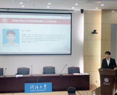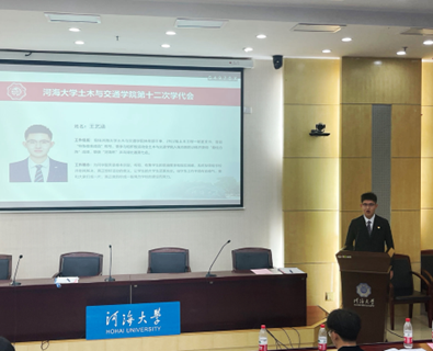 土木与交通学院学生会主席团成员席皓代表第十一届学生会作工作报告。报告从“强化思政引领,凝聚青年力量”、“持续推进改革,完善组织建设”、“坚持守正创新,打造土木品牌”、“牢记服务宗旨,传递土木之声”四个方面回顾了第十一次学生代表大会以来学院学生会工作取得的进展和成果,并提出对未来工作的设想和建议,聚焦保持和增强政治性、先进性、群众性,力争做好“强化校区共治,凸显土木关怀”“提高志愿覆盖,激发土木活力”“完善科创体系,赓续土木品牌”三个方面的工作,构建学生会工作新格局。