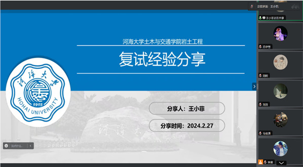 2024年2月29日18:30,土木与交通学院2024年考研复试经验分享会于线上成功举办。本次分享会邀请到开云电竞网土木与交通学院硕士研究生马俊潇、王小菲,浙江大学建筑工程学院硕士研究生袁颖皓,东南大学土木工程学院硕士研究生刘雅担任主讲人,会议由土木与交通学院2020级辅导员李倩老师主持,2020级部分学生聆听了分享会。