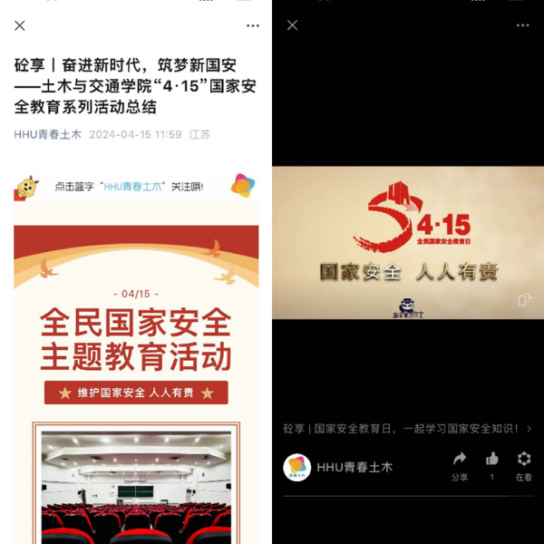 土木与交通学院通过“青春土木”公众号、官方视频号等新媒体宣传平台进行“反邪教警示教育进校园”专题宣传展示及国家安全日基础知识普及。宣传内容涵盖国家安全日的由来、国家安全的组成、公民的义务与权利等八个方面,并搭配视频解说,让师生全方位走进国家安全日,明确个人的言行要求。推文及视频在师生间引发热议,促进大家对国家安全产生思考。